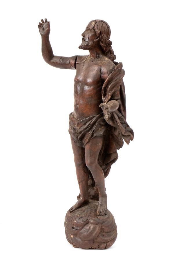 Altezza x larghezza x profondità: 55 x 30 x 17 cm La figura del Cristo risorto è scolpita con un atteggiamento solenne, con il braccio destro sollevato in un gesto di benedizione e il sinistro leggermente aperto. Il corpo è seminudo, coperto da un drappo che avvolge i fianchi e cade sulle gambe, mentre un mantello si appoggia sulla spalla sinistra.