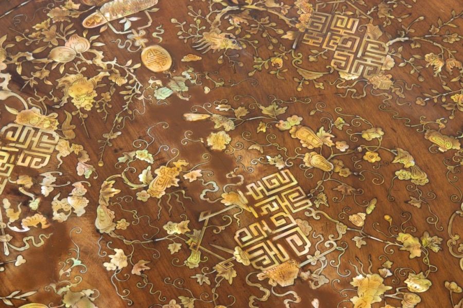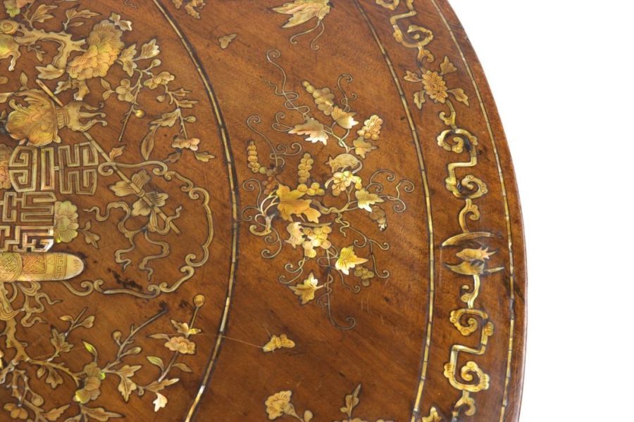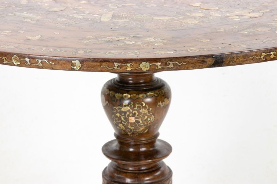 Tavolo orientale in noce e madreperla XIX secolo Altezza x diametro: 68 x 88 cm.