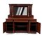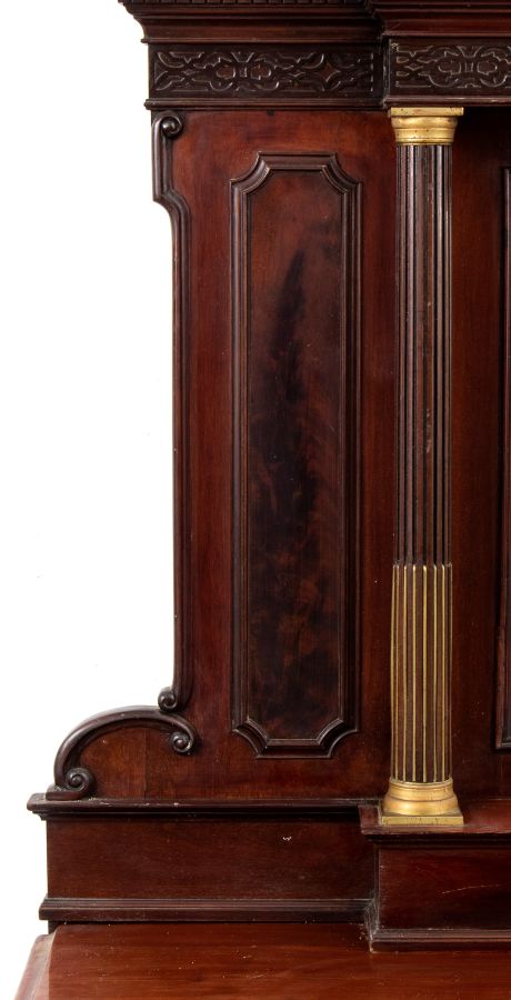 Altezza x larghezza x profondità: 181 x 191 x 66 cm in legno di mogano e piuma di mogano con quattro sportelli e tre cassetti: alzata decorata a traforo cieco con specchio centrale e due colonne con parti in bronzo dorato