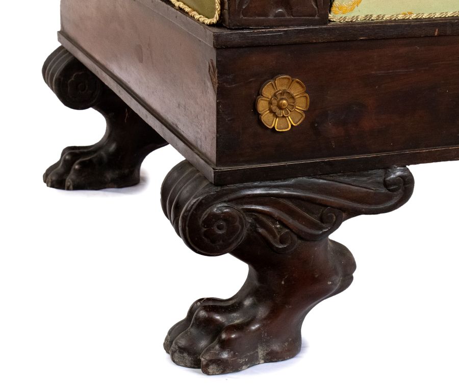 Altezza x larghezza x profondità: 84 x 177 x 64 cm. in legno di piuma di mogano, con applicazioni neoclassiche in bronzo dorato, da centro e sorretta da quattro gambe ferine.
