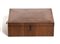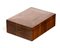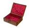 Altezza x larghezza x profondità: 15 x 46 x 35 cm in legno di noce con intarsi in legno di bosso a motivi floreali intervallati centralmente da cigni. Sui fianchi due maniglie in ottone.