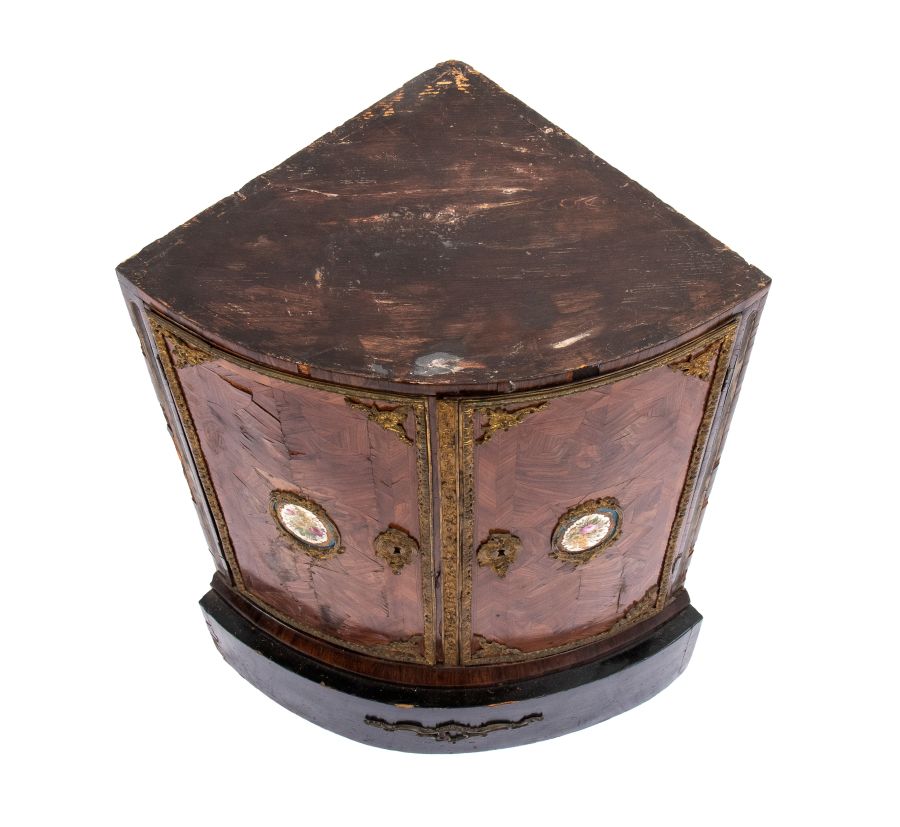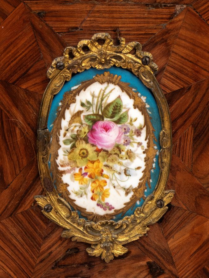 Altezza x larghezza x profondità: 91 x 67 x 47 cm. con applicazioni in bronzo dorato e placche di porcellana dipinte, piano in marmo bianco Carrara.