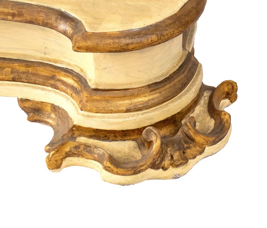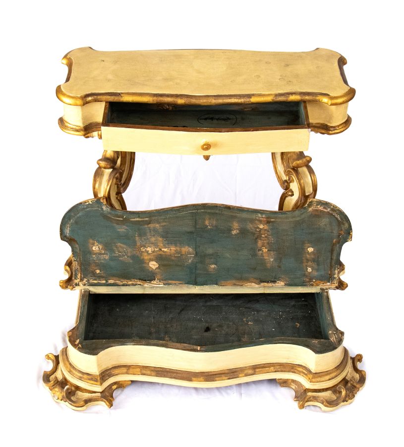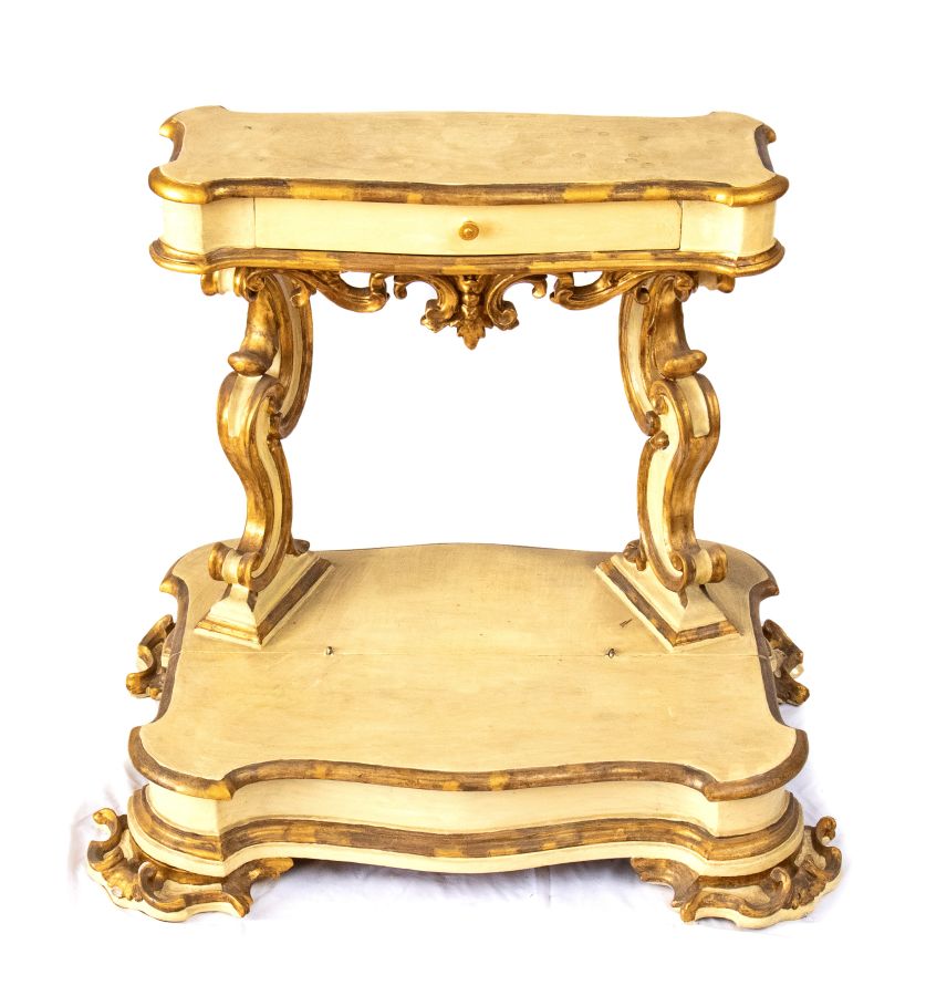 Altezza x larghezza x profondità: 87 x 100 x 70 cm laccato e con parti dorate a foglia , piano con cassetto sorretto da due colonne scolpite e poggianti su basamento rettangolare mosso, che cela un vano per i libri.