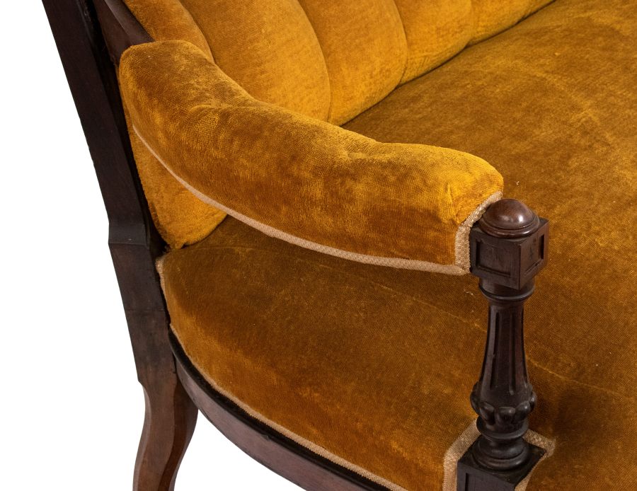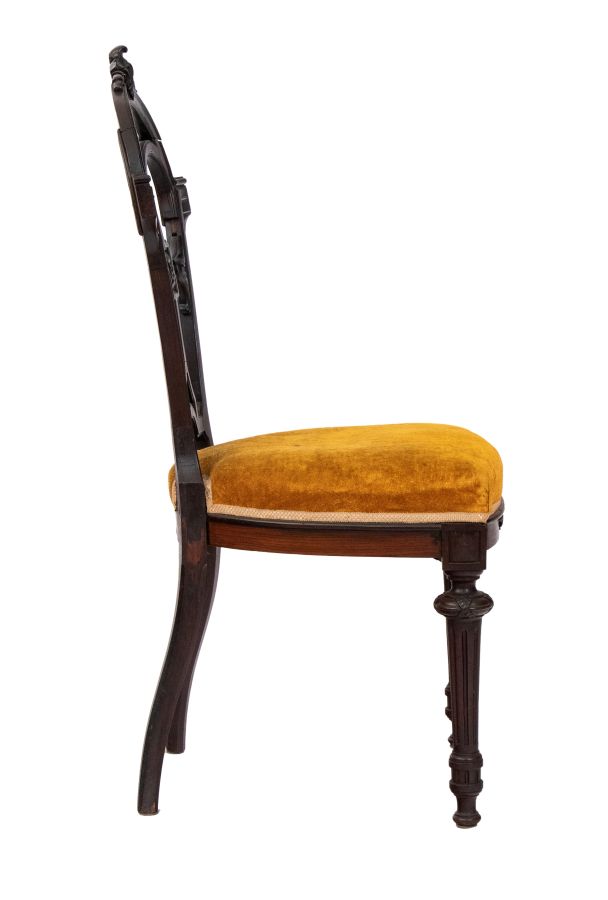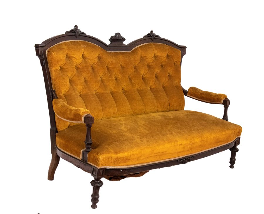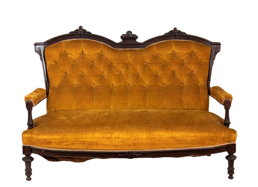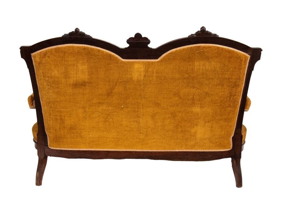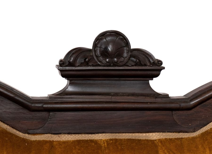 Altezza x larghezza x profondità: 110 x 157 x 68 cm, seduta 58 cm; 94 x 44 x 41 cm, seduta 45 cm in legno di palissandro, sedie e divano intagliati nelle classiche forme del periodo Luigi Filippo francese.