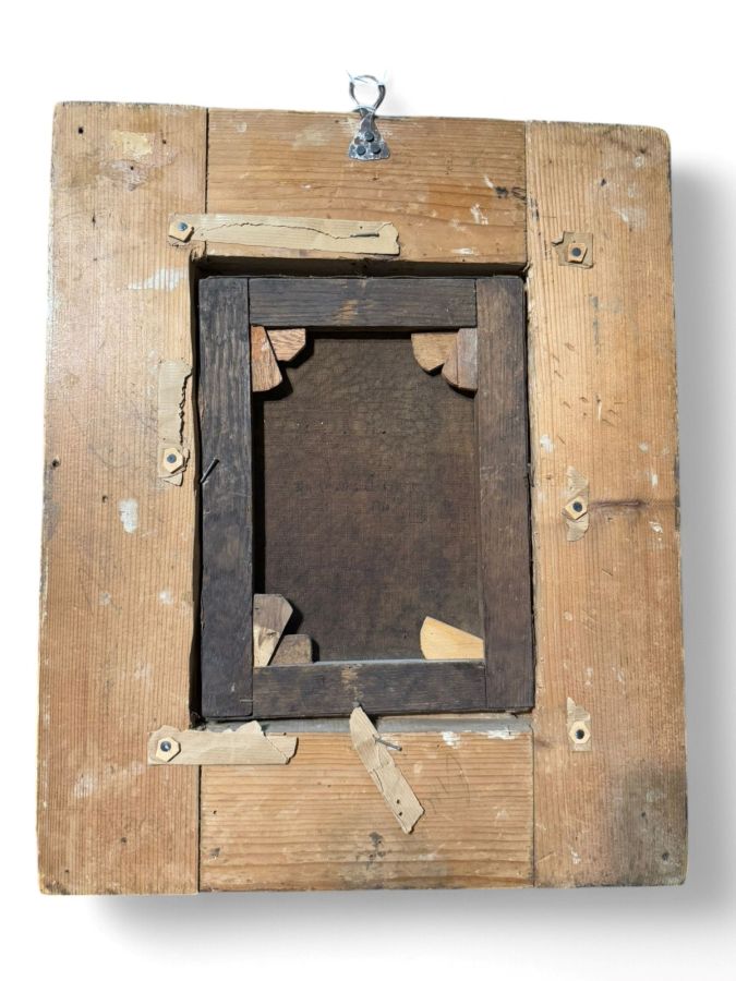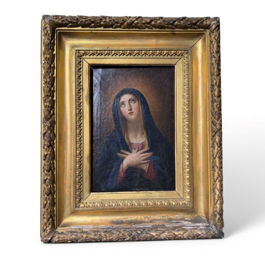 Olio su tela Altezza x larghezza: 25 x 19 cm. raffigurante la figura frontale della Vergine dolente, date le mani sul petto e lo sguardo al cielo. La donna indossa le vesti blu, tipiche della sua iconografia, e l'aureola è rappresentata come un fascio di luce che illumina da dietro la figura.