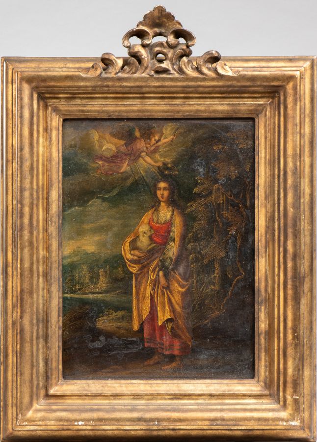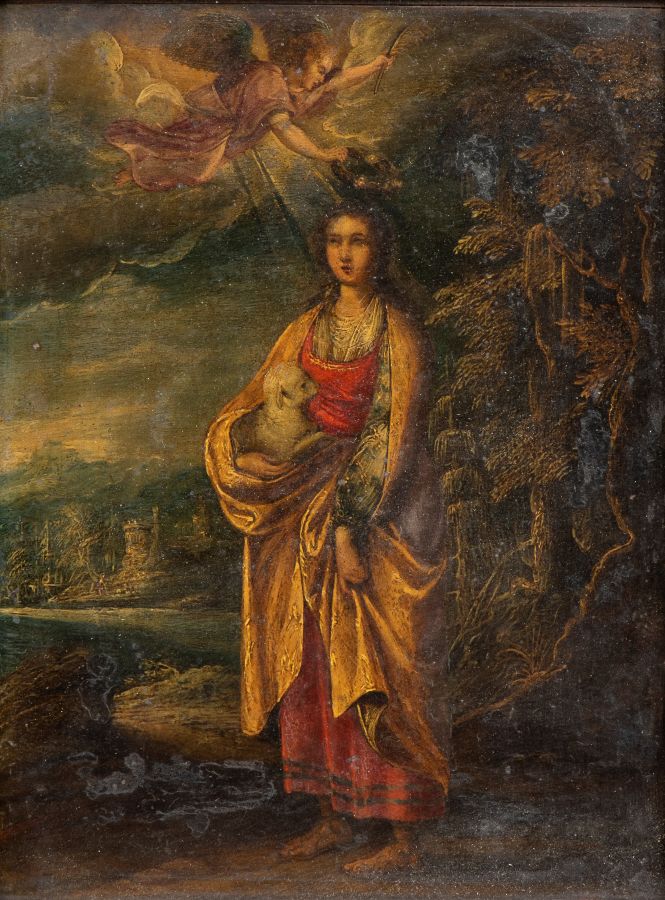 San'Agnese con angelo Scuola italiana, inizio XX secolo Olio su tela applicata su masonite 41 x 37 cm