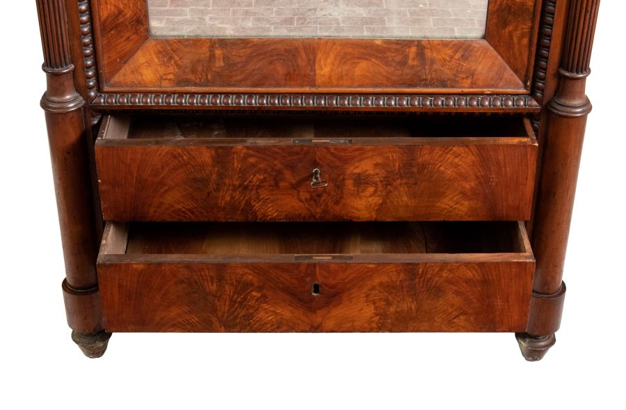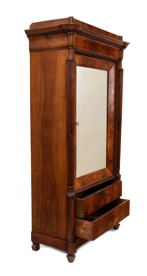 Altezza x larghezza x profondità: 212 x 115 x 55 cm. in legno di noce e piuma di noce con specchio centrale e due cassetti; colonnine scanalate poste sui lati.