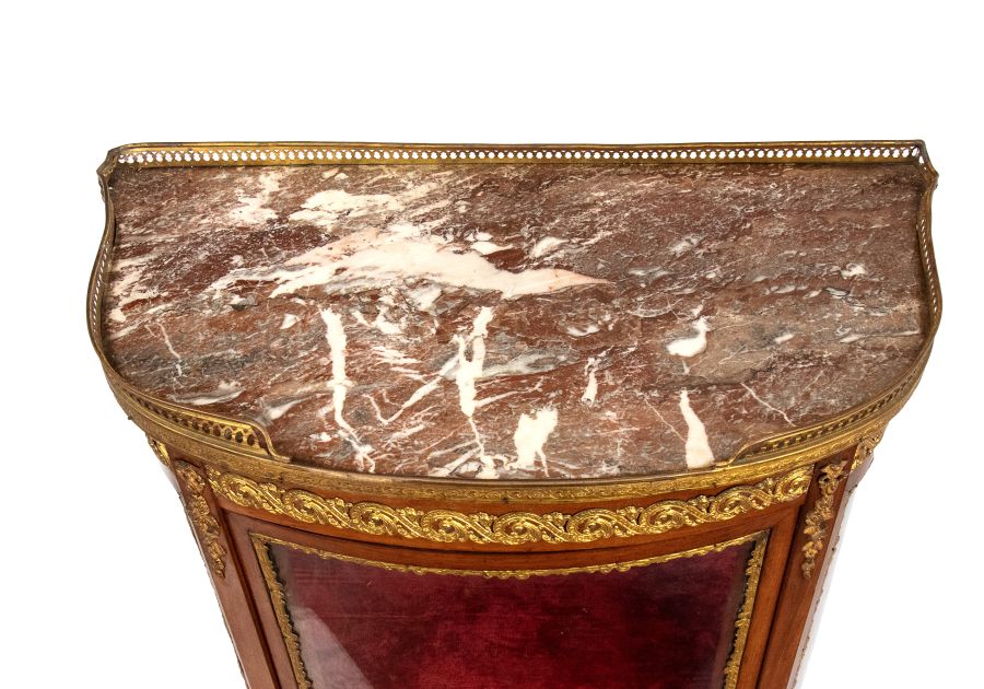 Altezza x lunghezza x profondità: 140 x 67 x 32 cm. in legno di mogano di forma sagomata, con applicazioni in bronzo dorato e piano in marmo rosso Francia.