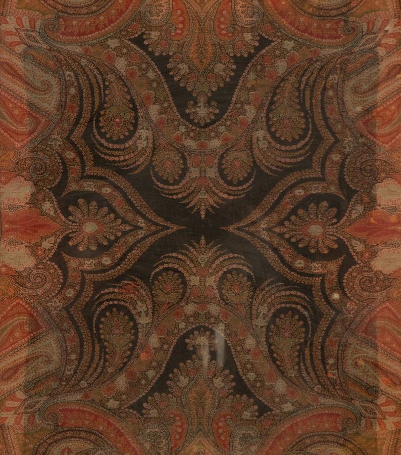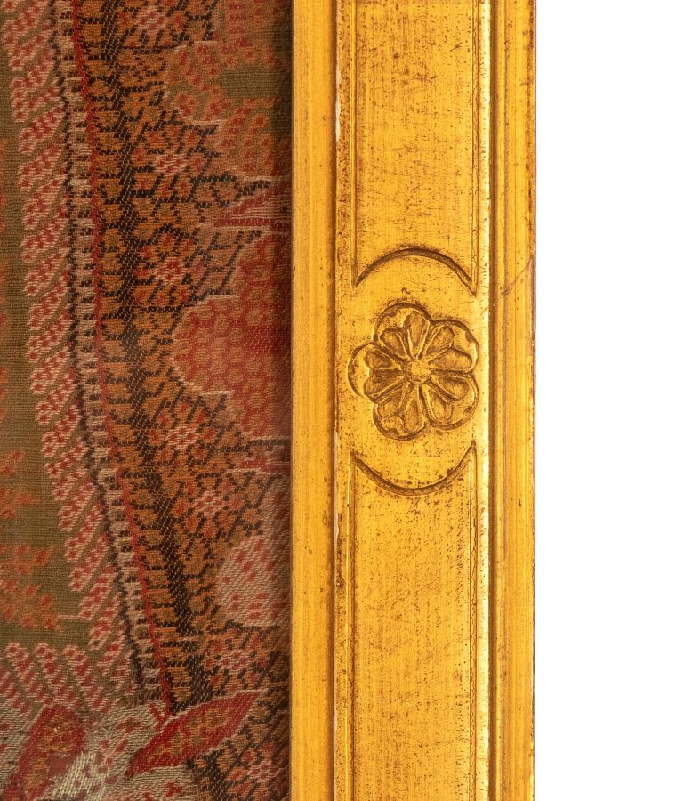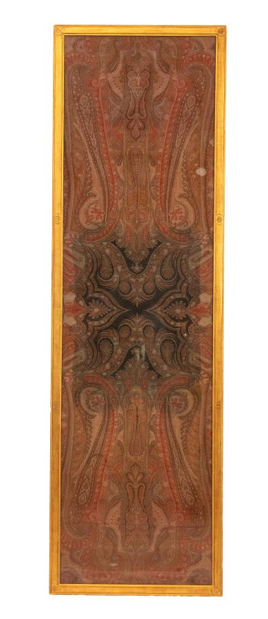 Altezza x larghezza: 239 x 73 cm. di forma rettanglare decorato ad arabeschi e code di pavone. Entro cornice dorata.