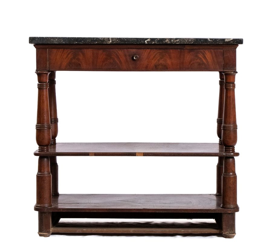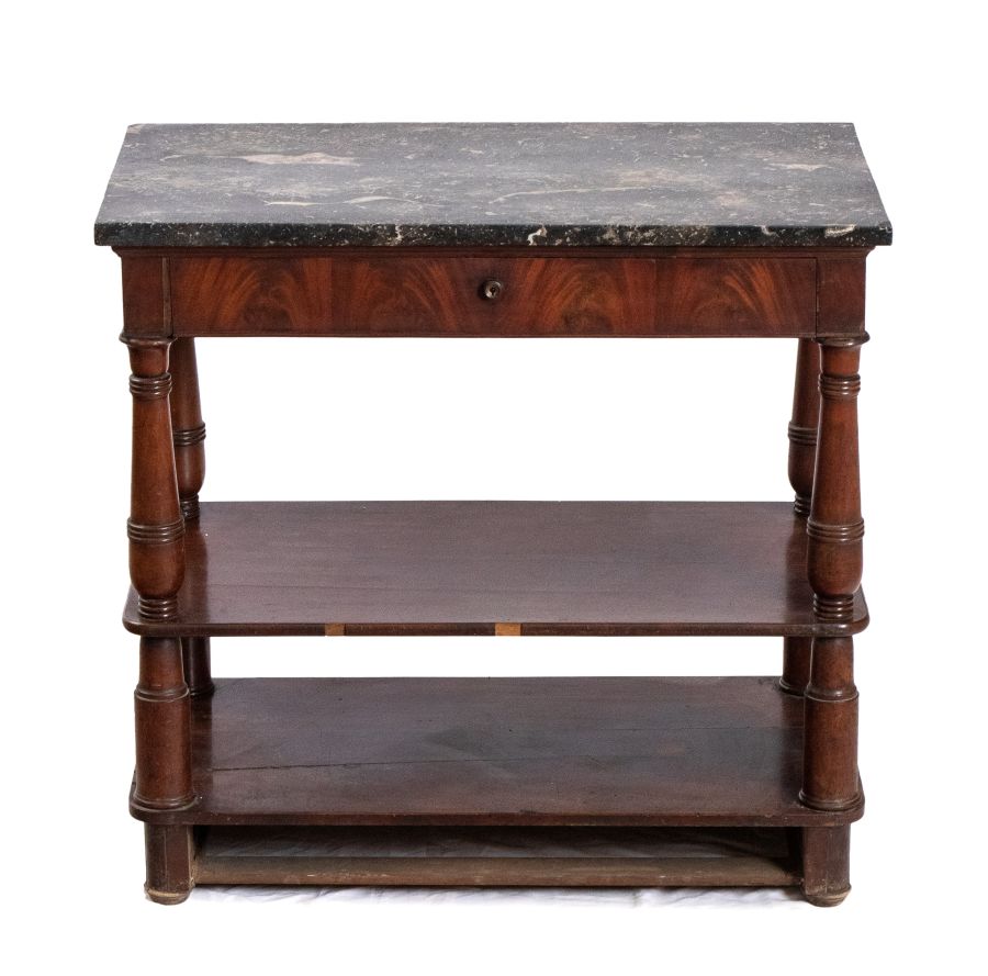 Altezza x lunghezza x profondità: 76 x 81 x 44 cm piano in marmo, forma ad etagere con primo cassetto a scrittoio con piano in pelle a scomparsa.