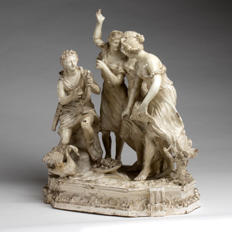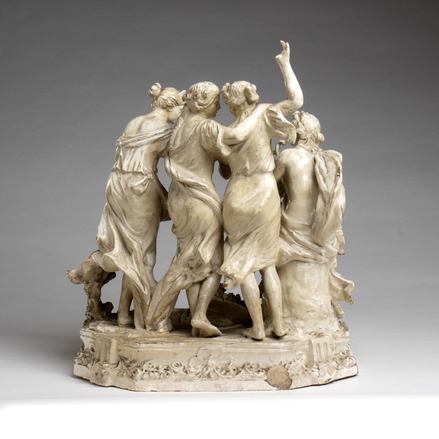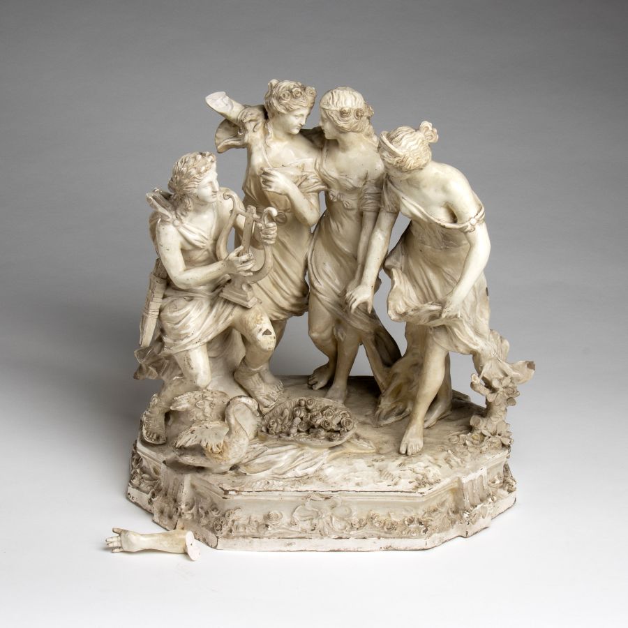 Altezza x larghezza x profondità: 39 x 35 x 24 cm gruppo scultoreo in ceramica raffigurante il dio Apollo e le Tre Grazie.