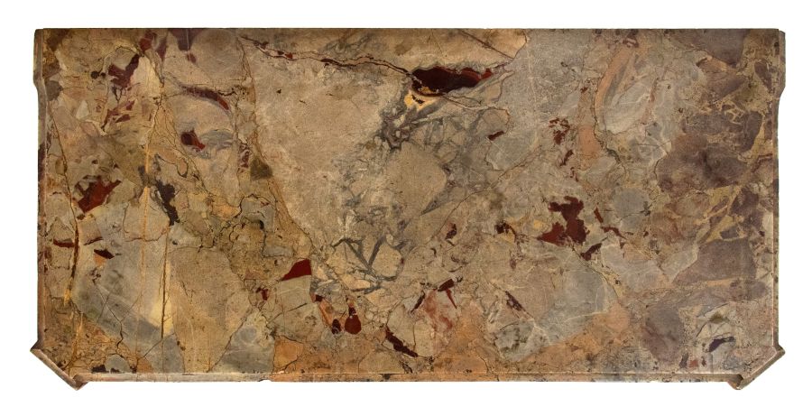 Altezza x larghezza x profondità: 85 x 83 x 39 cm lastronato in legno di ebano viola disposto a spina di pesce, intarsiato a motivi floreali in legno di bosso con applicazioni in bronzo dorato. Il piano in marmo Patagonia