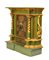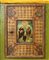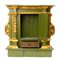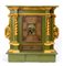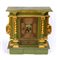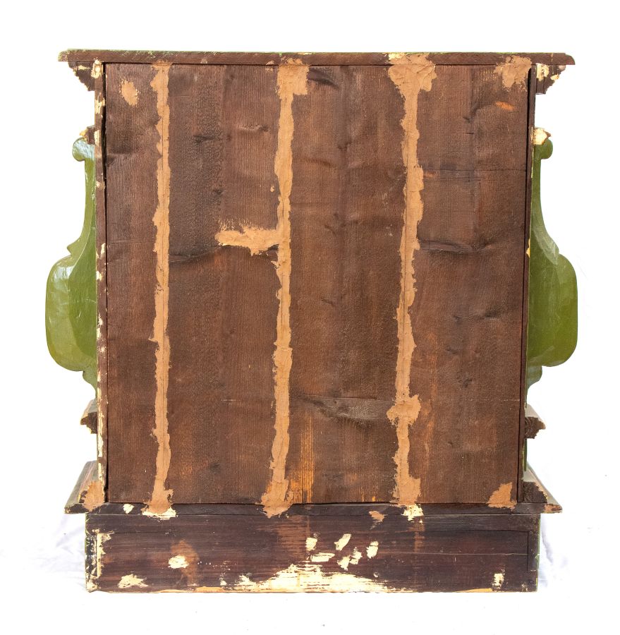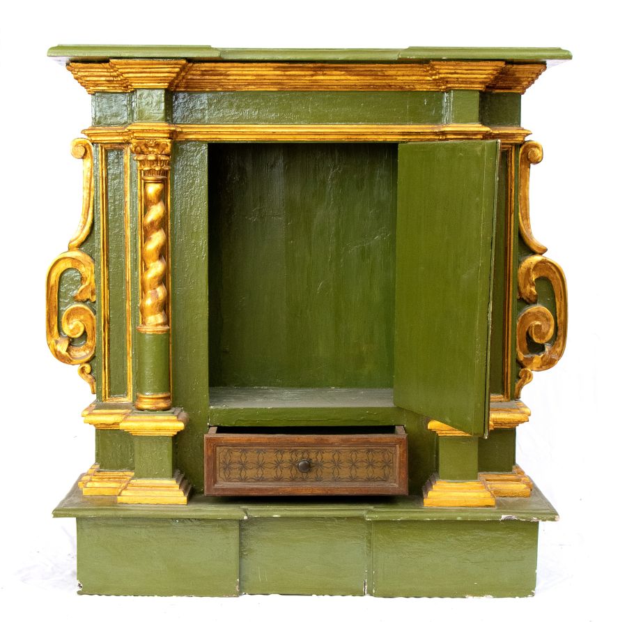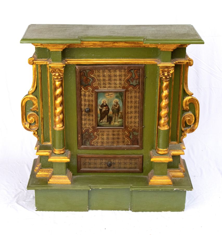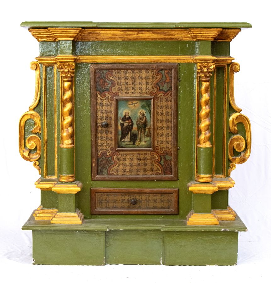 Altezza x larghezza x profondità: 107 x 100 x 37 cm struttura architettonica in legno laccato verde con colonne a tortiglione e fregi dorati, cassetto sottostante e anta centrale dipinta con Sant'Antonio Abate e Sant'Onofrio.