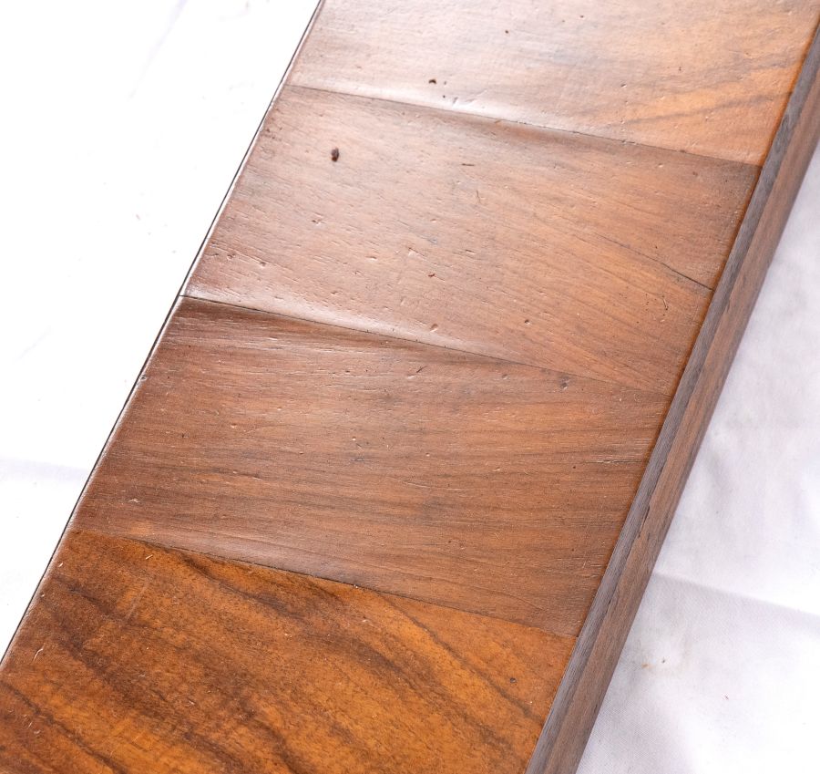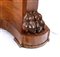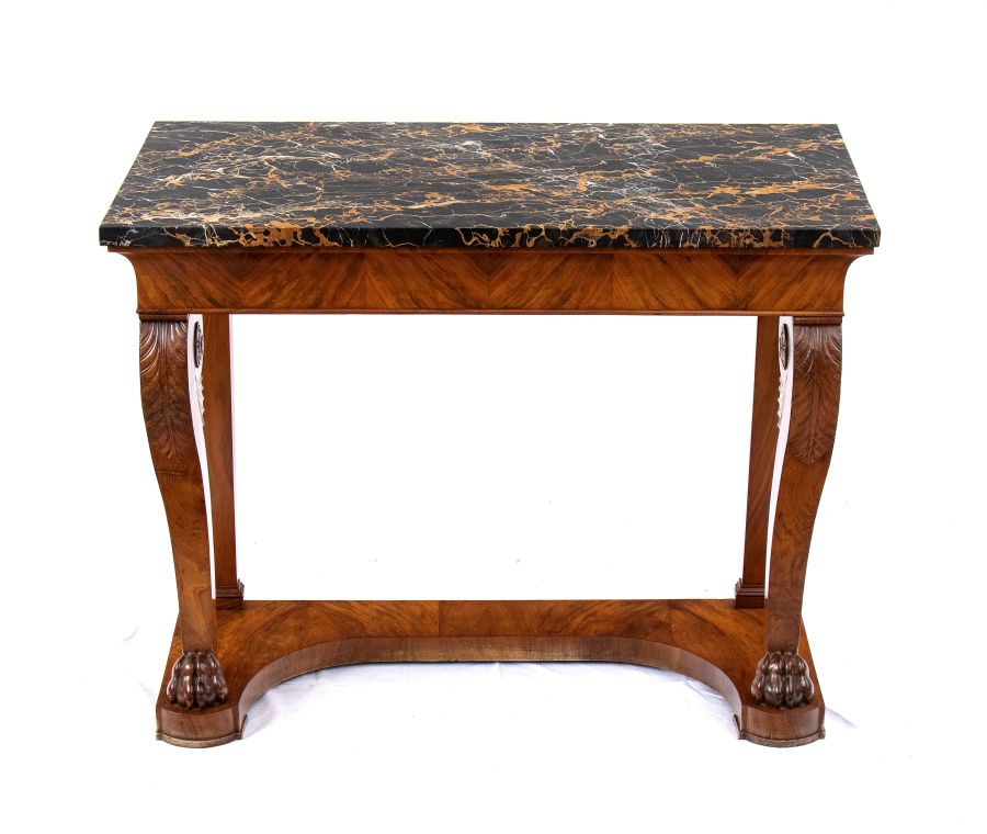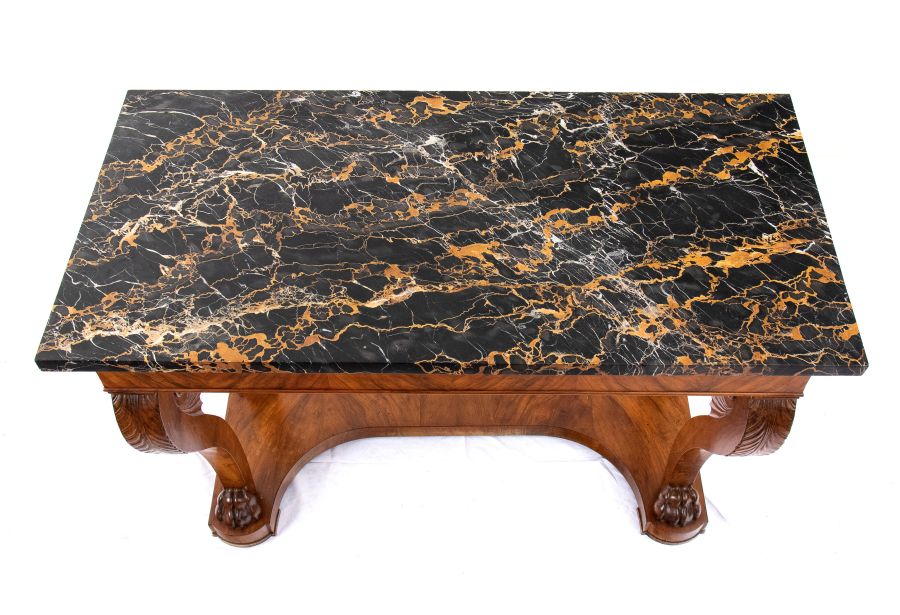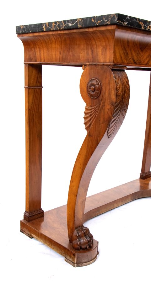 Altezza x larghezza x profondità 93x 115x 55 cm lastronata in noce, piano in marmo di forma rettangolare, fascia liscia, sostegni posteriori diritti e anteriori in foggia di grande voluta rivolta verso l’interno ornata nella parte superiore da foglie d'acanto nella parte frontale e rosoni laterali, piedi a zampa ferita, pedana sagomata.