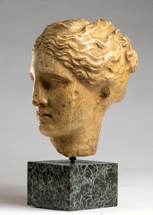 Altezza x larghezza x profondità: 40 x 15 x 25 cm la testa in gesso e poggiata su di un basamento di marmo verde quadrato. Igea è la dea della salute e dell'igiene.