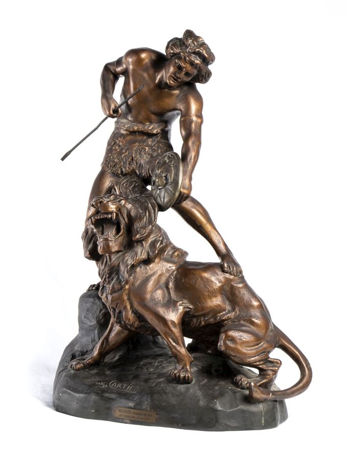 Dimensioni 63 x 50 x 27 cm. intitolata "Belluaire terrassant un lion", in bronzo patinato.