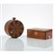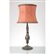 Lume in metallo argentato lavorato con paralume in tessuto, scatola in legno con applicazioni in rame e borraccia in legno con intarsi.