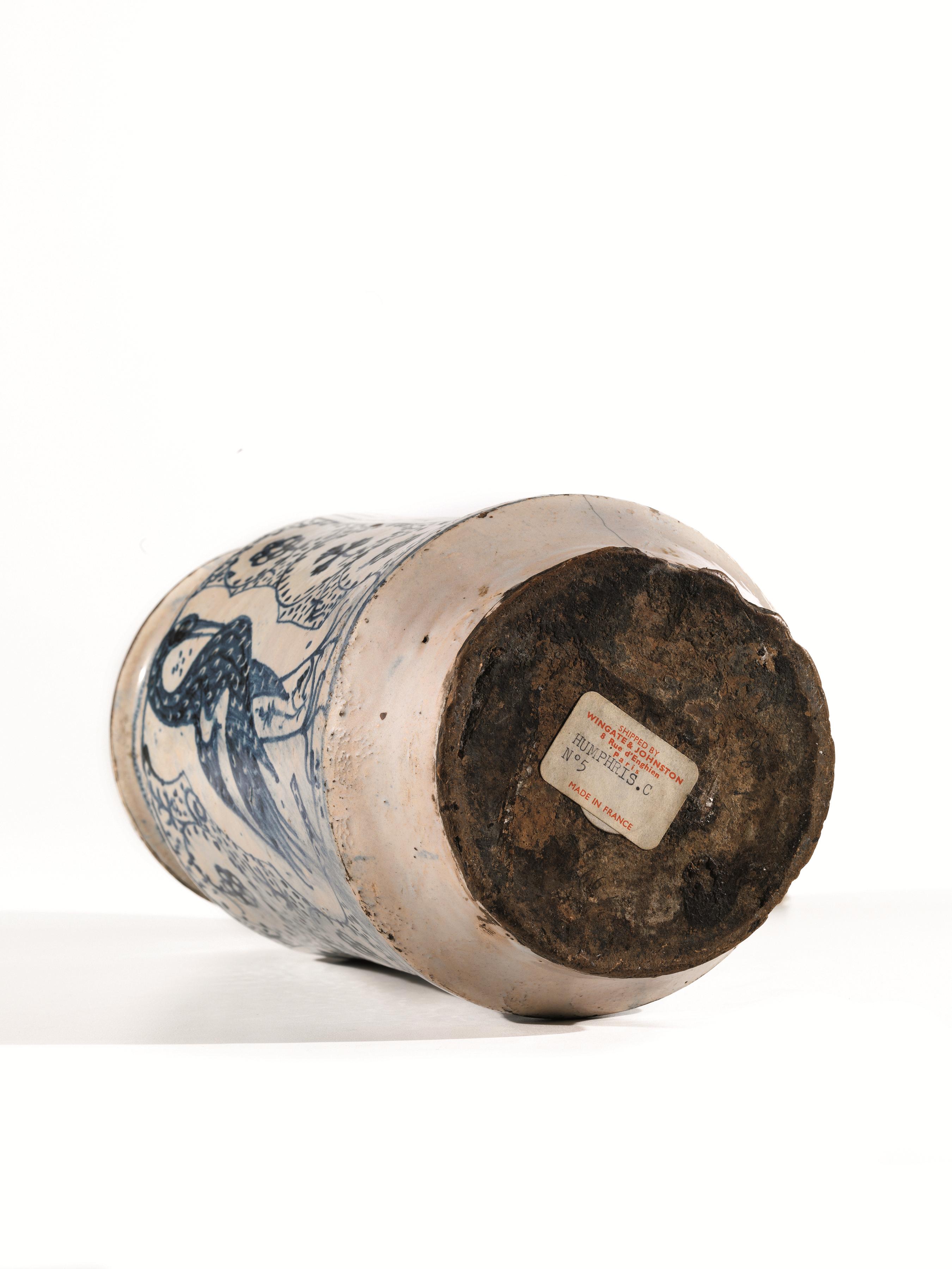 Joseph Chompret, pubblicando l’albarello, lo attribuiva a manifattura fiorentina e lo datava al 1460. Carmen Ravanelli Guidotti, analizzando un esemplare di dimensioni minori della collezione Fanfani e un altro appartenente alla raccolta Cora, sposa l’attribuzione alle manifatture di Montelupo ipotizzata da Cora nella sua monumentale opera.