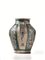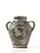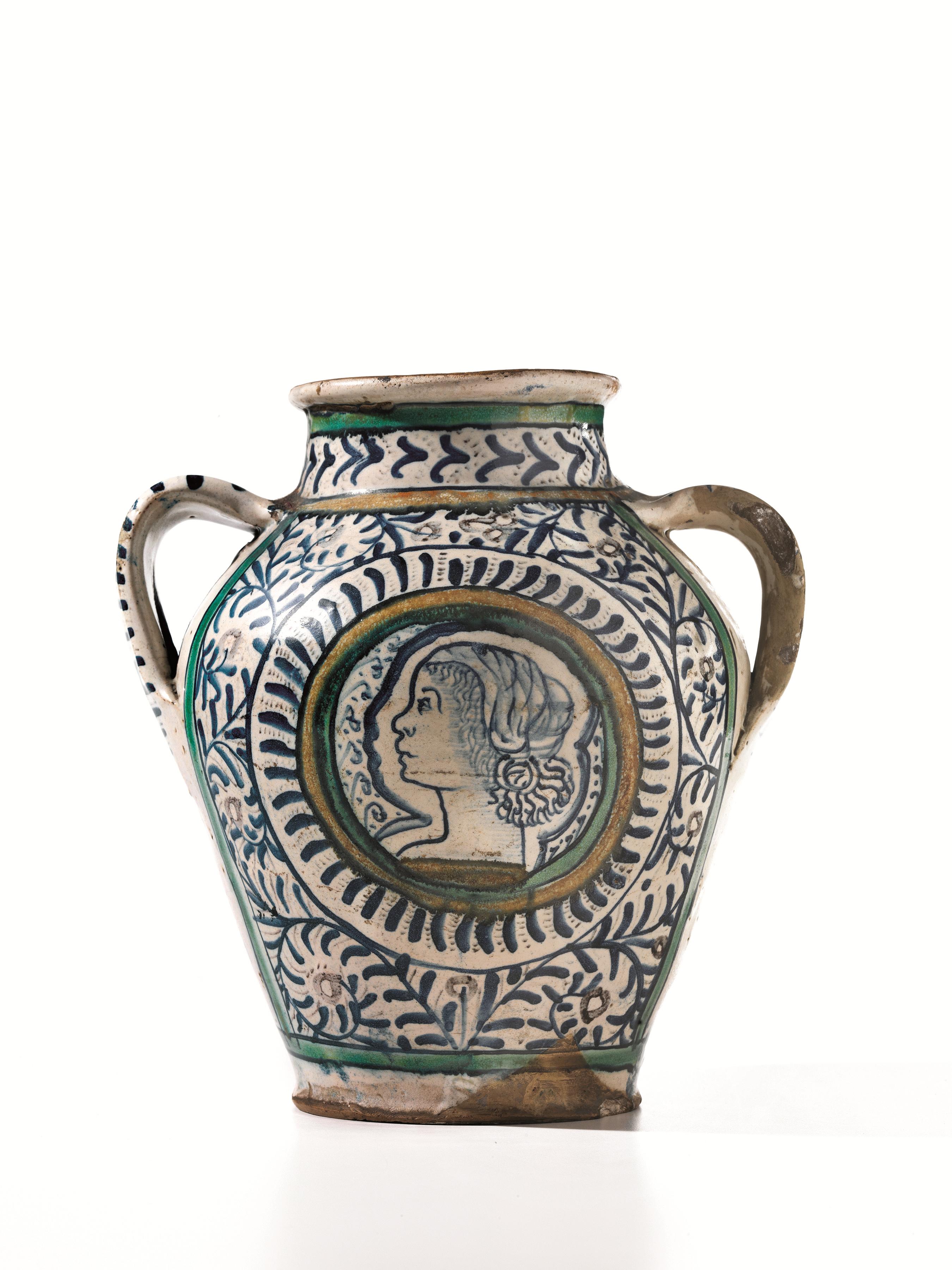 La decorazione del collo vede un sottile nastro di colore verde, profilato di blu, che orla una fascia con una serie continua di segni blu a virgola alternati a sottilissime puntinature in manganese: un nastro giallo separa il collo dal corpo. Qui la decorazione mostra due ritratti di profilo racchiusi entro medaglioni circolari incorniciati da fasce concentriche di colore verde e giallo, e da una più larga a tratti blu con puntinature in manganese. I profili sono circondati da una riserva che ne segue la forma, le campiture vuote sono riempite da piccoli fiori multipetalo e da decori fitomorfi. Il ritratto maschile indossa un copricapo a punta, mentre quello femminile ha un fazzoletto annodato attorno al capo. La parte restante del corpo del vaso è decorata da larghe girali fitomorfe con foglie alternate a piccoli fiori e a sottili elementi a tratteggio. Sotto l’attacco delle anse compare una marca con il segno della “scala”.