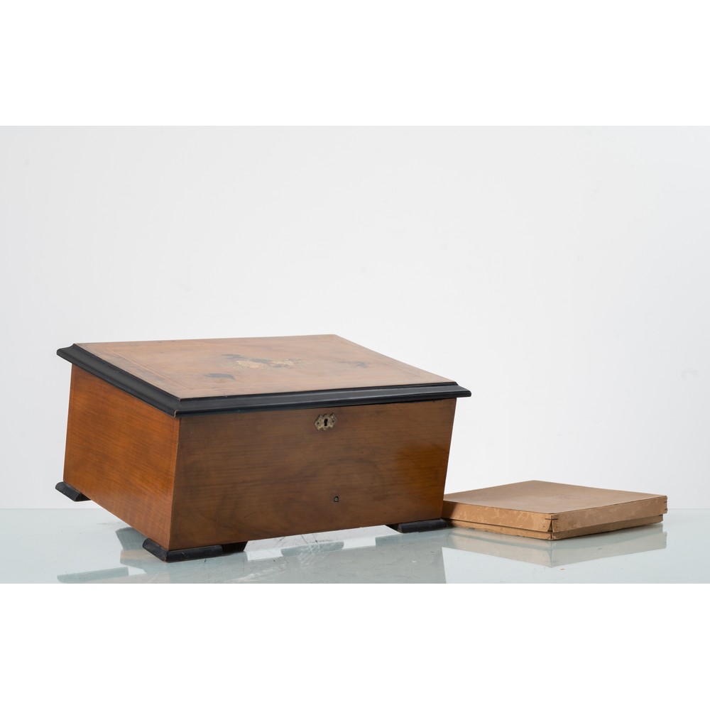 Carillon a disco Edelweiss con dodici dischi, cassa in legno di noce e radica di noce, tarsie a motivo musicale e perfili in bosso.