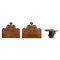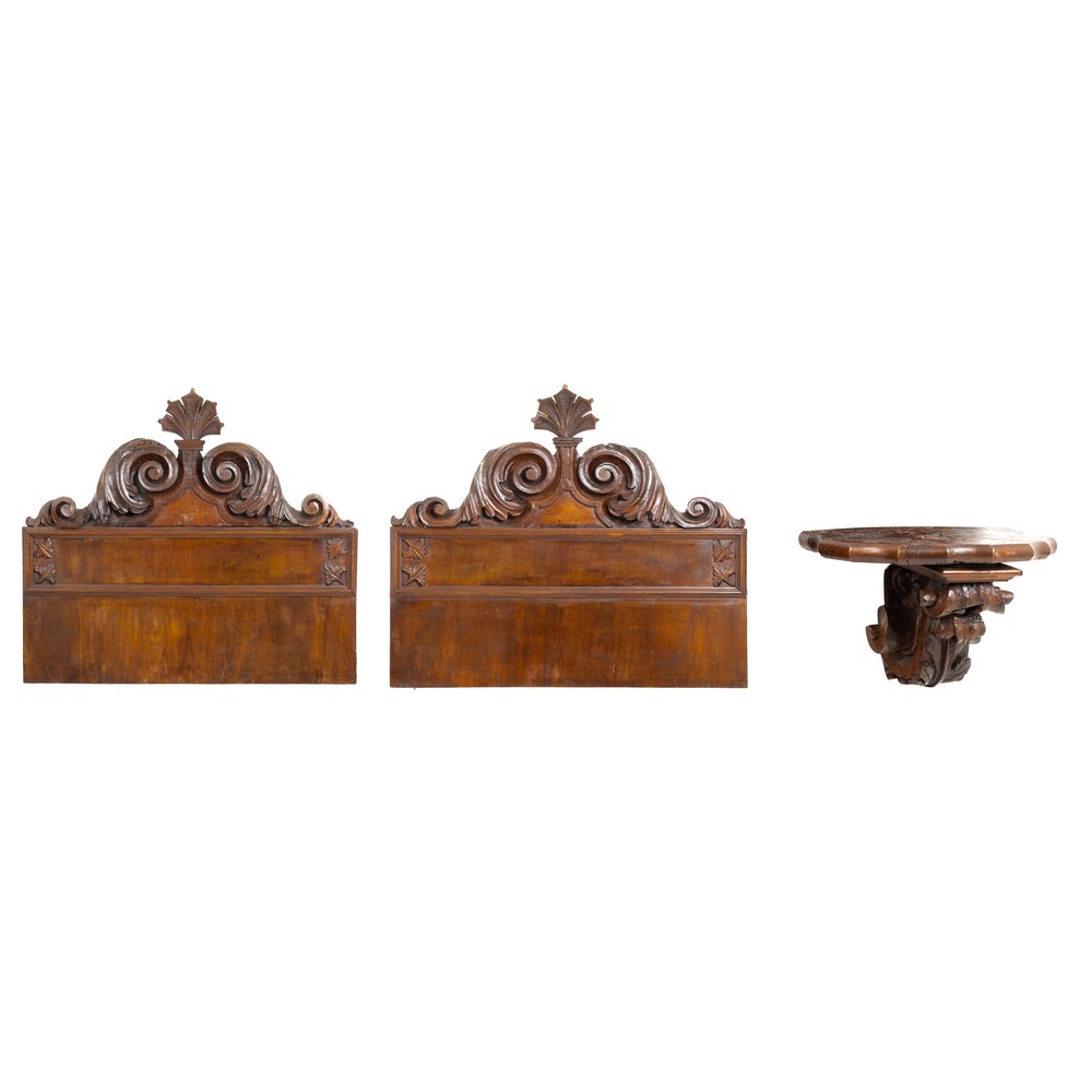 Coppia di fregi in legno di noce trasformate a testate di letto e fregio in legno di noce trasformato a mensola.