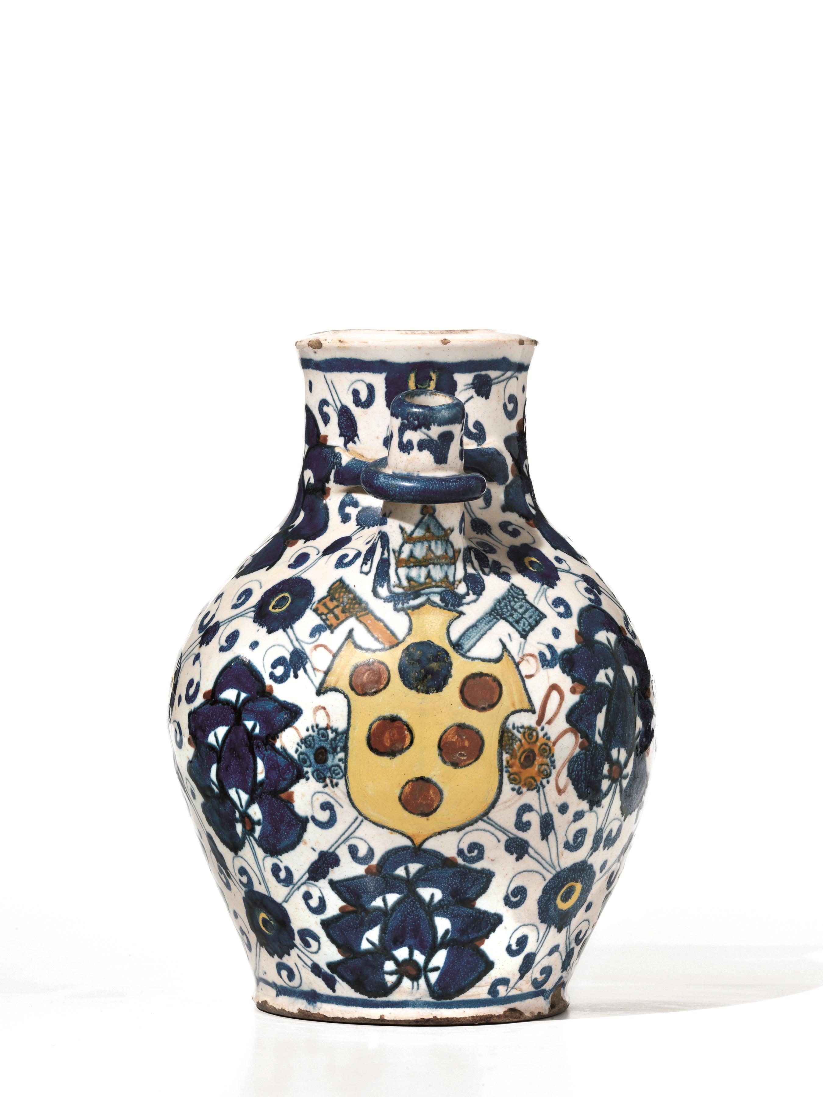 Lungo tutto il corpo si sviluppa un decoro a “palmette”, interrotto solo da uno stemma collocato sotto il beccuccio e da una riserva al di sotto dell’ansa, nella quale si legge la sigla della bottega. L’ansa è decorata con pennellate blu. Il decoro principale è realizzato in blu di cobalto con il ferraccia e il giallo antimonio utilizzati per dar luce alle palmette e poi riutilizzati nella decorazione dello stemma. Il gioco cromatico che alterna il giallo e il ferraccia è utilizzato nelle chiavi di San Pietro, e nelle rosette laterali allo stemma dominato dalla tiara papale. Lo stemma d’oro a sei palle – poste in cinta la prima, in capo d’azzurro caricata in tre gigli, le altre cinque in rosso – si riferisce a un papa della famiglia Medici: Leone X (1513-1521) oppure Clemente XVII (1523-1534).