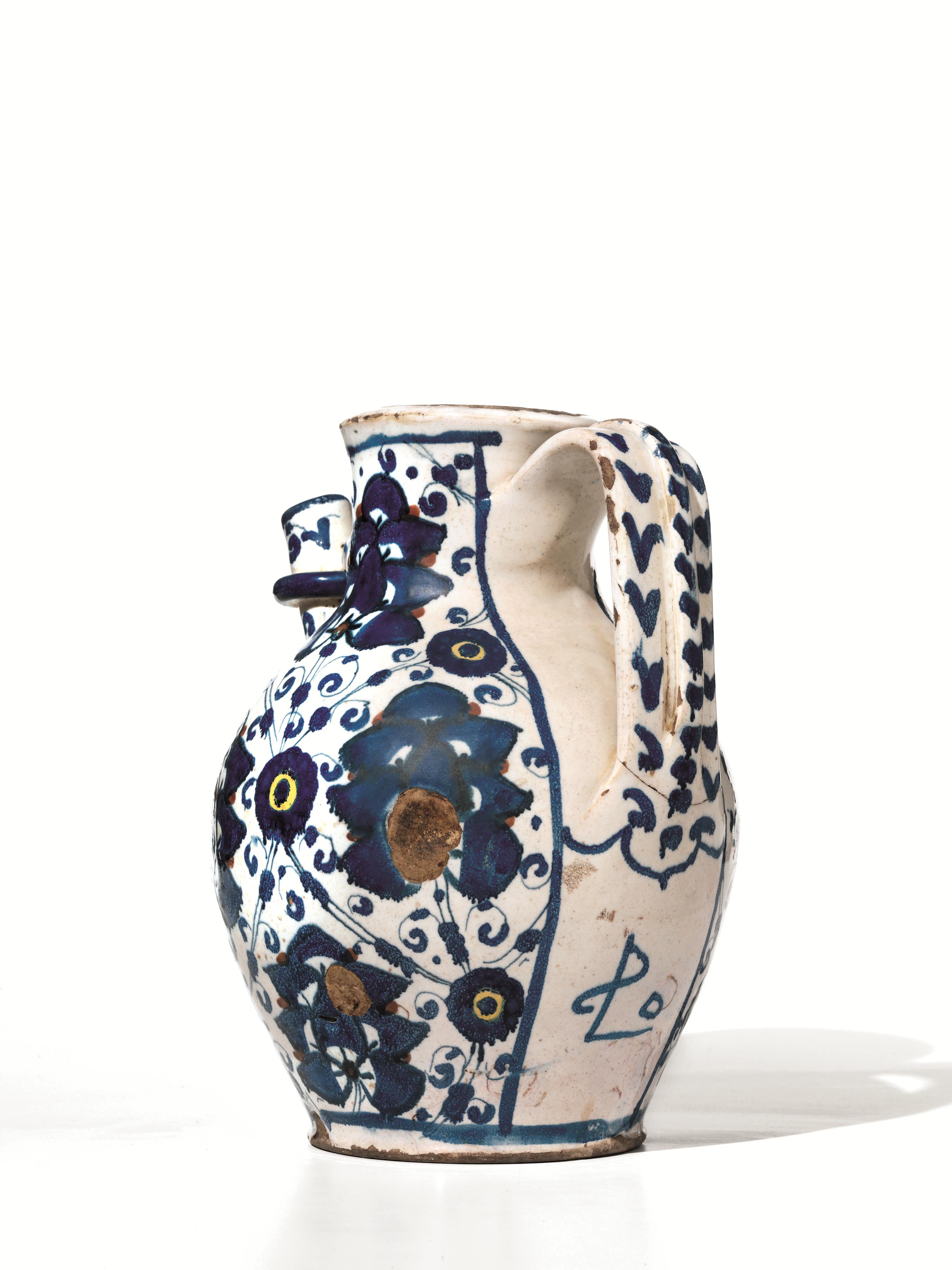 Intatto; sbeccature d’uso sull’orlo, sull’ansa e sul piede; lievi cadute di smalto sul corpo; segni di appoggio in cottura