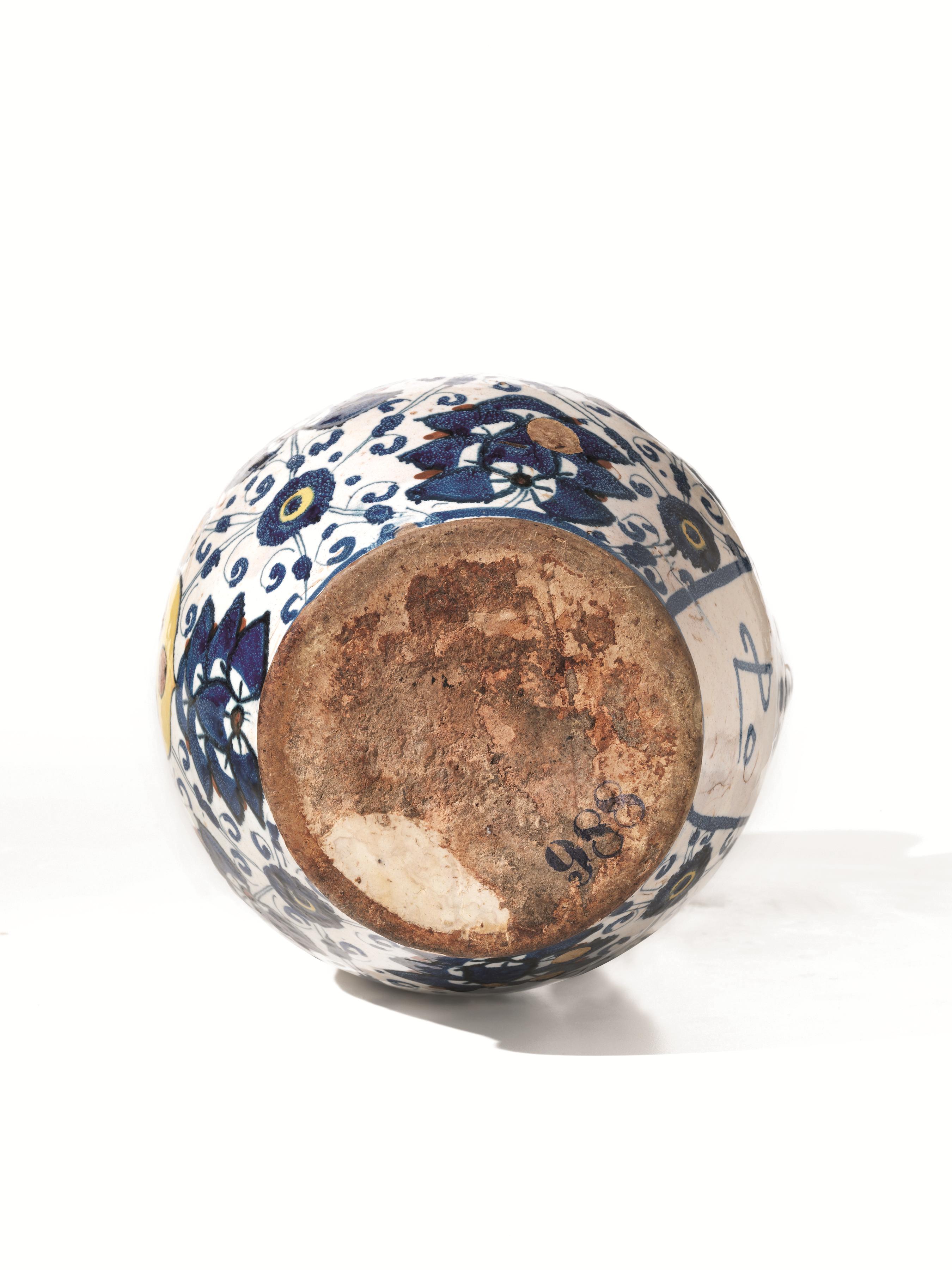 Earthenware, painted in an intense and textured cobalt blue, iron red, and antimony yellow