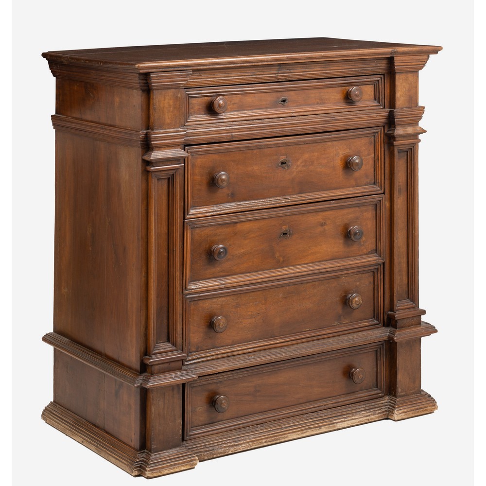Cassettone a cinque cassetti di gusto seicentesco in legno di noce.