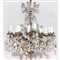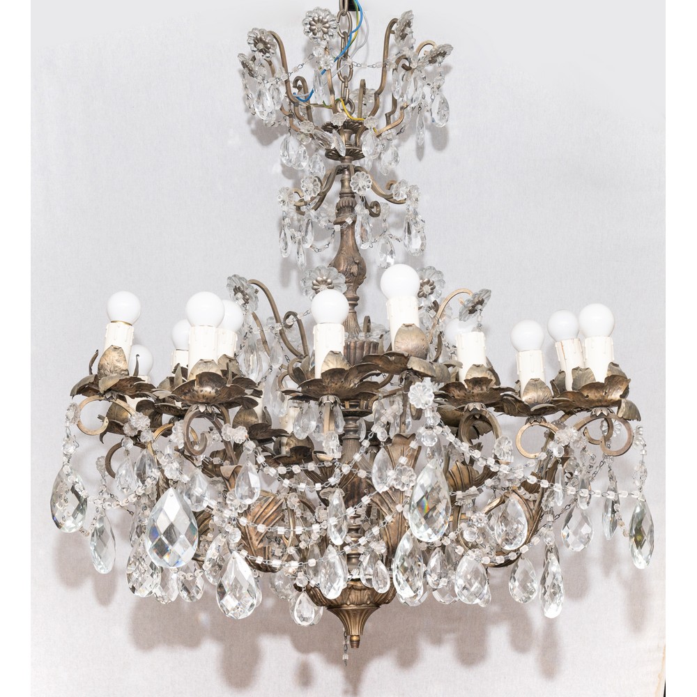Lampadario a dodici luci in metallo con gocce e brindoli in vetro.