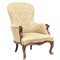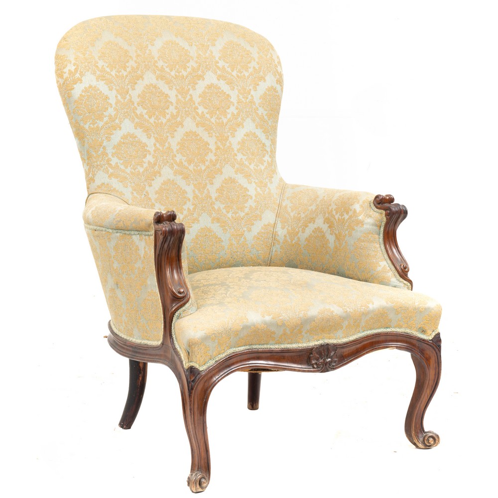 Poltrona Luigi Filippo in legno di mogano con seduta e spalliera imbottita in tessuto damascato.