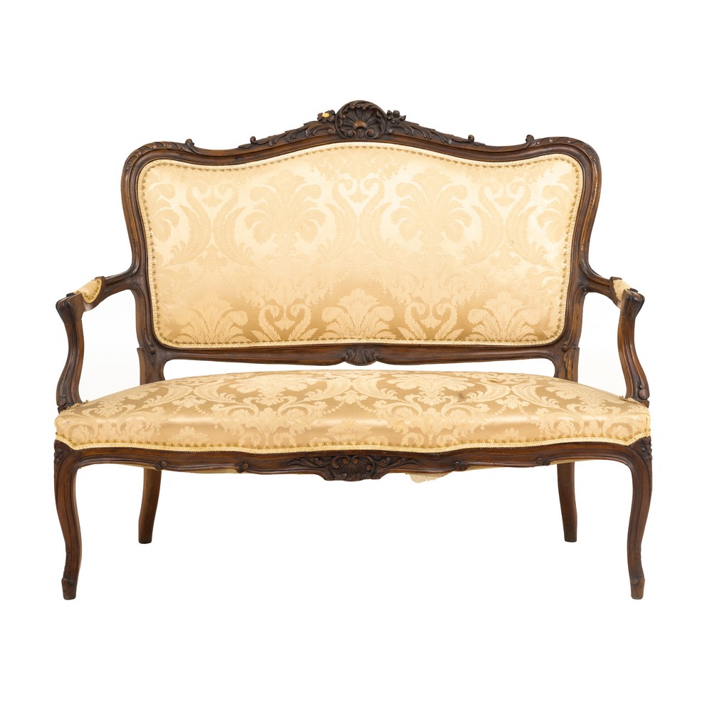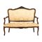 Divano a due posti stile Luigi XV in legno di noce con seduta e spalliera tappezzata.