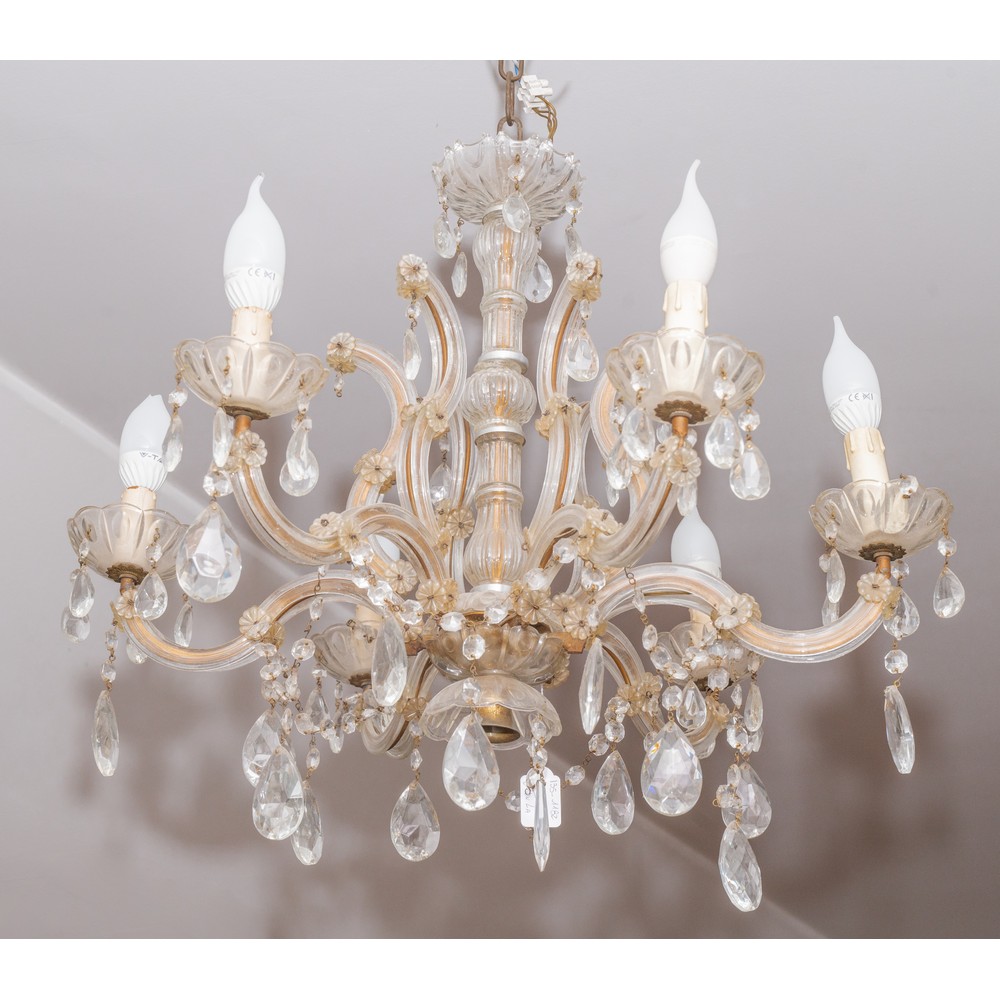 Lampadario Maria Teresa a sei luci con struttura in ferro, vetri e gocce.