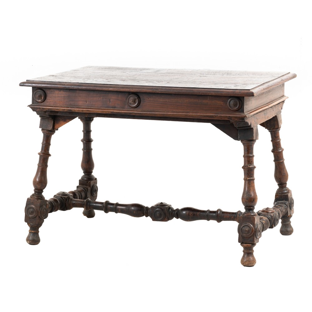 Scrittoio di gusto fratino in legno di noce con due cassetti.