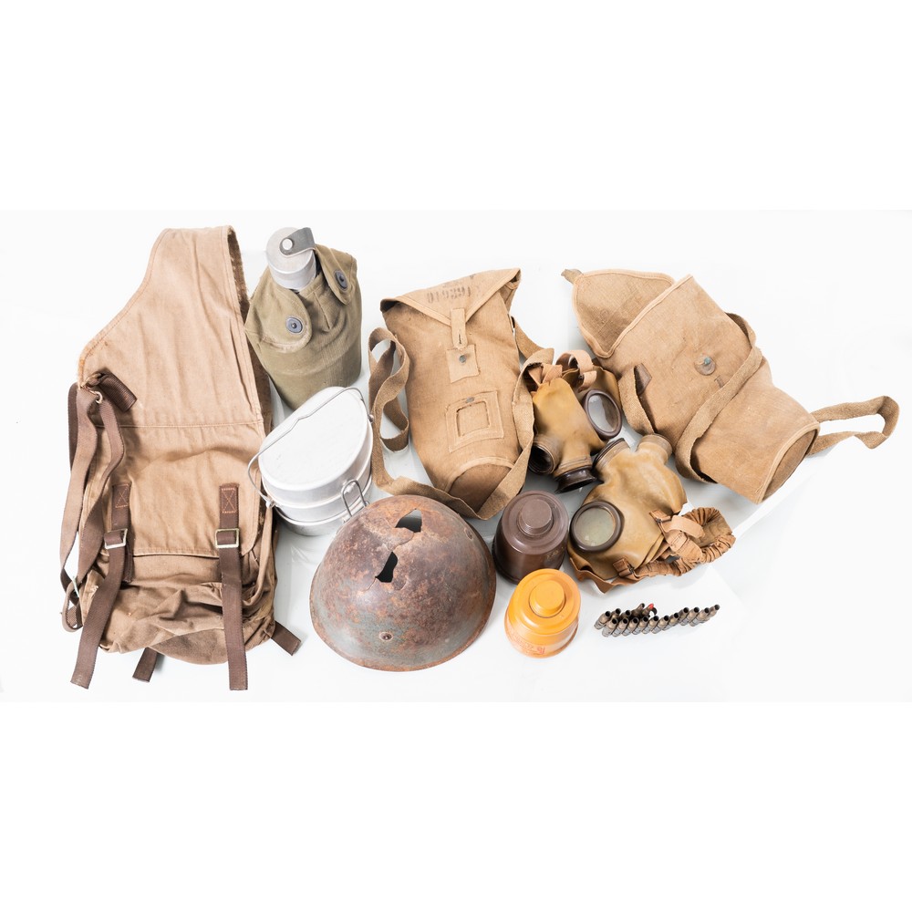Oggetti militari Italiani della seconda guerra mondiale composti da: elmetto, zaino, due maschere antigas con custodia, borraccia e gamella.