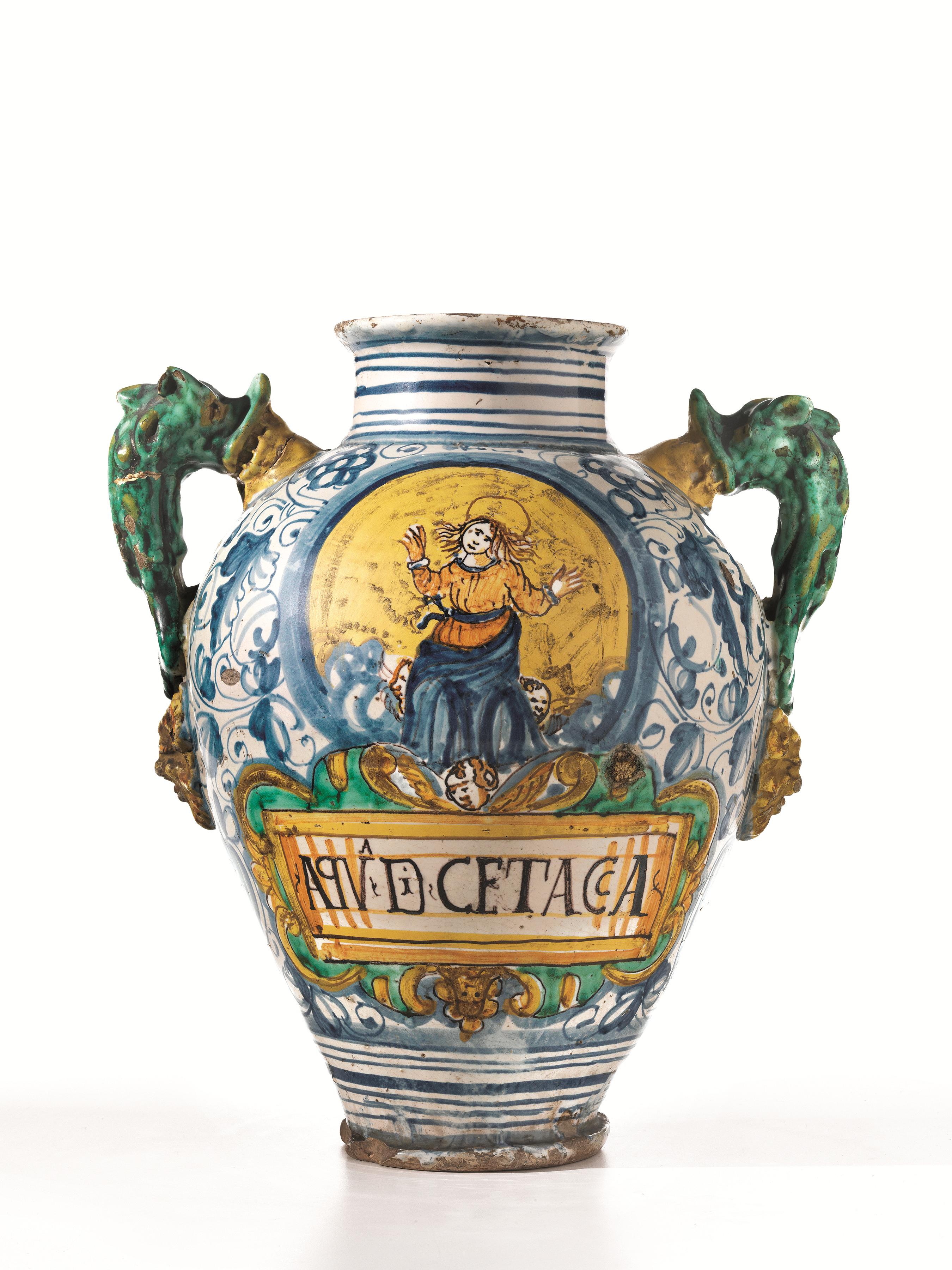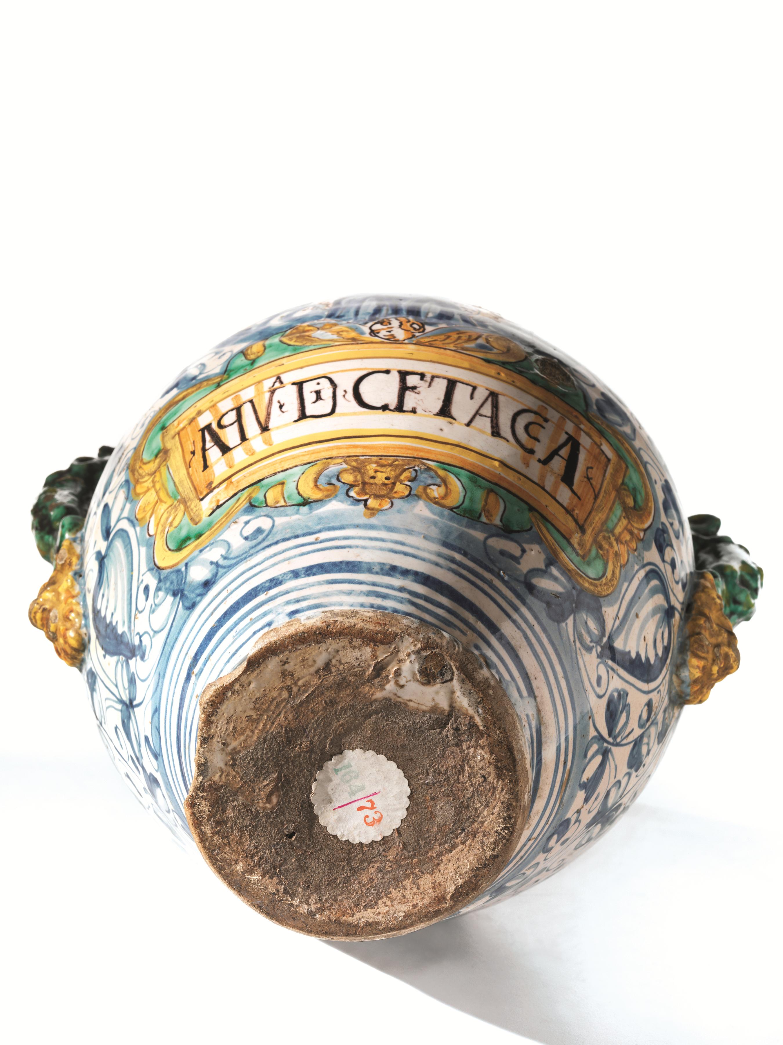 Il corpo è interamente decorato con un motivo fitoforme, delineato in blu su fondo smaltato bianco: si tratta del decoro denominato “alla foglia blu”, che prevede l’utilizzo della girali “foliate” qui in una versione atipica, sostanzialmente semplificata con un tratto rapido ma sicuro, che delinea le foglie sul fondo bianco con una prima linea sottile per poi riempire le zone a risparmio dando corpo alle ombreggiature della foglia e del frutto con una pennellata più marcata. Sul fronte, entro un medaglione delimitato da pennellate blu, su un fondo giallo mosso da pennellate brune spicca la figura dell’Assunta seduta su una nuvola e sorretta da Angeli con le mani aperte nel segno dell’orante. Al di sotto del medaglione un cartiglio reca la scritta apotecaria, delineata a caratteri capitali, in bruno di manganese nel tono del marrone “AQVa Di CETACcA”. Il cartiglio è incorniciato da un motivo a volute verde ramina centrato nella parte superiore da un amorino e in quella inferiore da mascherone.