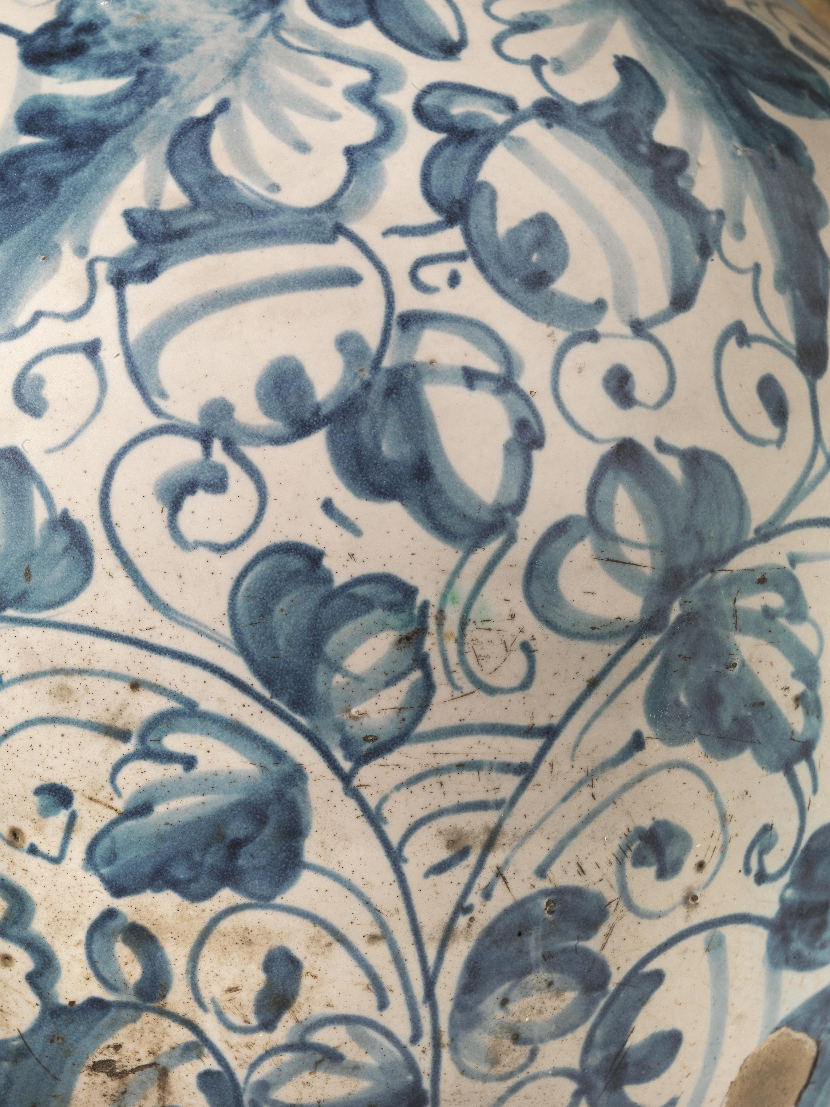 La decorazione “alla foglia blu” è tipica della produzione degli ultimi fornimenti da farmacia di produzione montelupina, e Fausto Berti fa notare come l’opzione decorativa sia stata scelta anche da due forniture farmaceutiche ancora di rilievo, quella dell’Annunciazione e quella di Tobia accompagnato dall’Angelo, forse addirittura eseguite dalla stessa bottega con datazione intorno agli anni Quaranta del ’600.