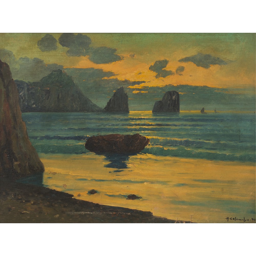 A. COLOMBO, Faraglioni al tramonto, Olio su cartone