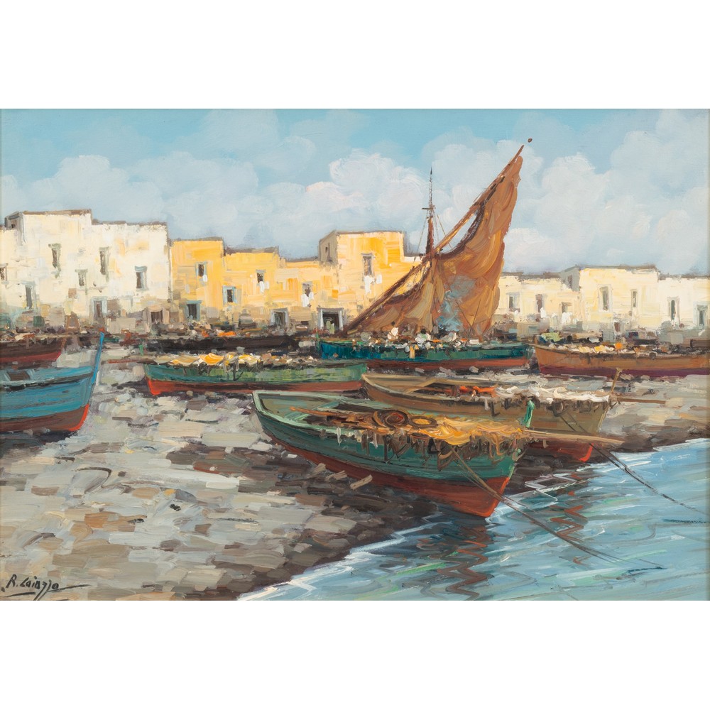 RAFFAELE CAIAZZO, Paesaggio con barche a secco, Olio su tela