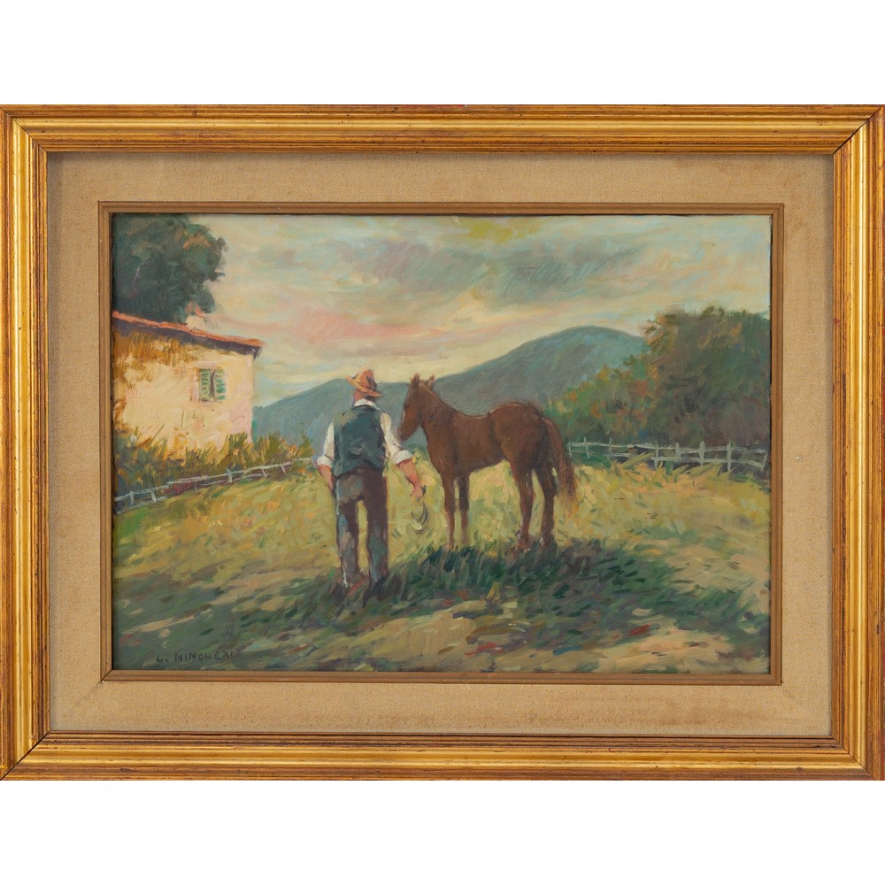 PITTORE DEL XX SECOLO, Uomo e cavallo, Olio su tela