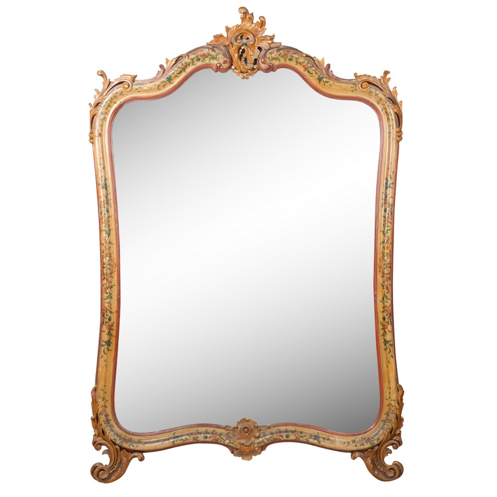 Grande specchiera da fondo sala in legno intagliato, laccato e dipinto, specchio coevo (usure).