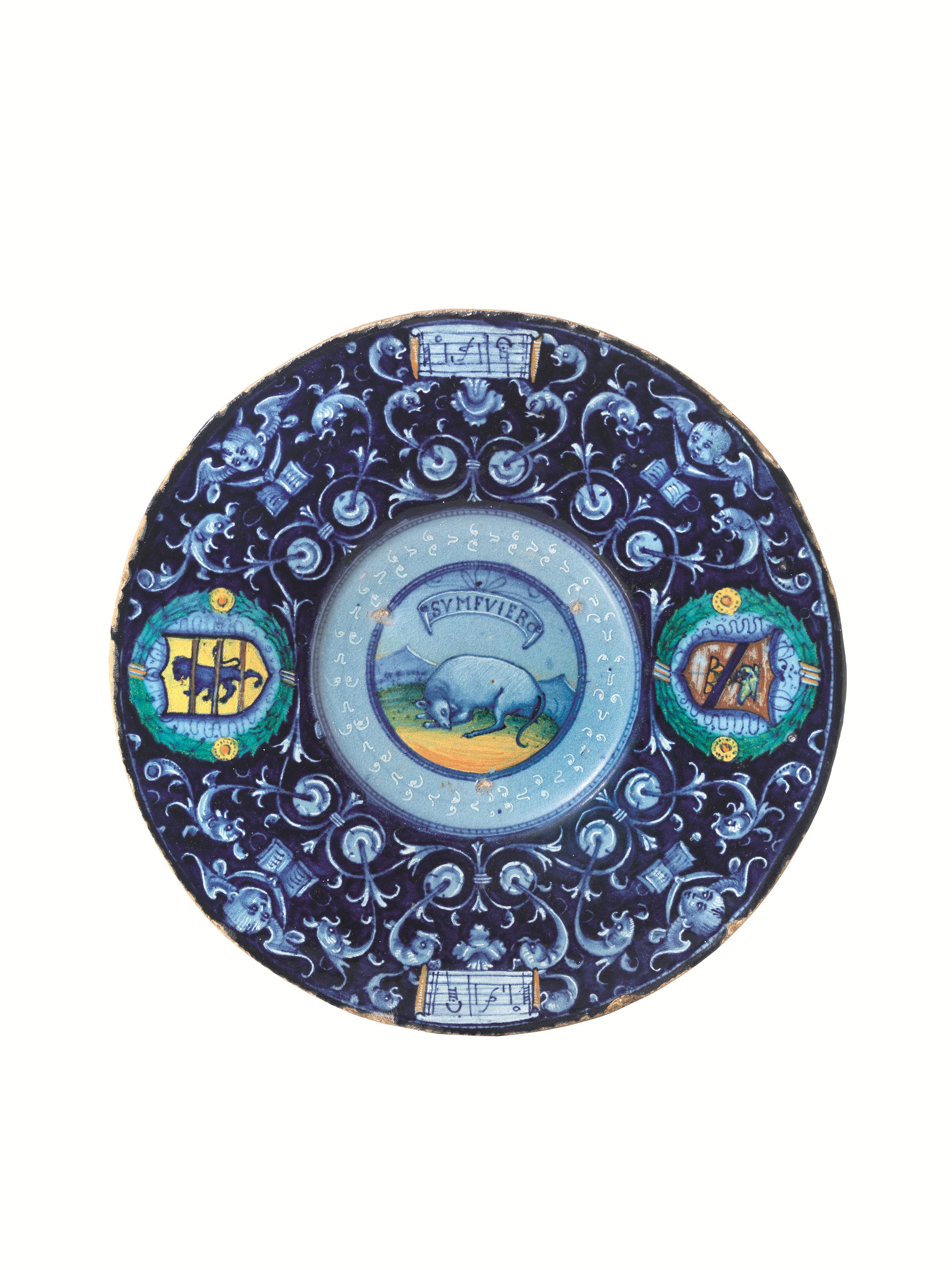 Il piatto o tondino, integralmente ricoperto da smalto “berettino”, ha cavetto profondo e larga tesa appena obliqua. Il decoro presenta al centro, racchiuso in un medaglione incorniciato da una fascia decorata in bianco su azzurro, un segugio dormiente in un paesaggio montuoso, sopra il quale campeggia un cartiglio con la scritta “SUM FVI ERO”. Sulla tesa si estende una decorazione a grottesche centrate nei punti cardinali da due cartigli con note musicali e da due riserve circolari contenenti due stemmi. Il primo, dei Martellini del Falcone, di rosso, al monte di sei cime d’oro sostenente un falcone sorante dello stesso (oppure al naturale, sonagliato d’oro), talvolta con la zampa destra alzata, in atto di afferrare il sonaglio con il becco, e alla banda diminuita d’azzurro attraversante sul tutto. Il secondo stemma, su campo giallo con leone rampante e bande blu, è da attribuire alla famiglia Tedaldi.