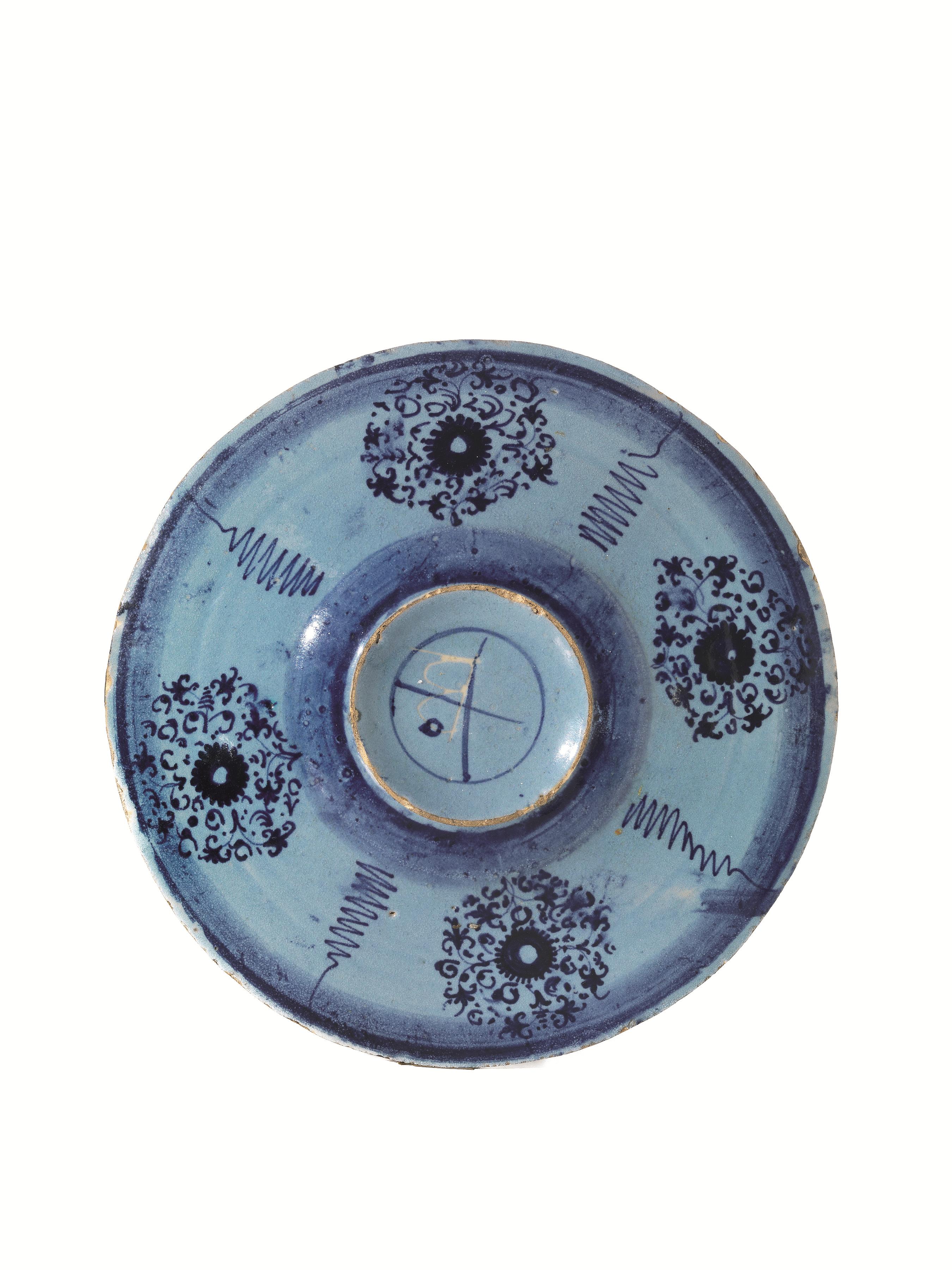 Sul retro un motivo decorativo a spirali e fioroni a corolla continua circonda il piede, nel quale è dipinto un cerchio barrato da una croce con cerchio più piccolo in uno dei quartieri, e una “B” incisa nello smalto prima della cottura.