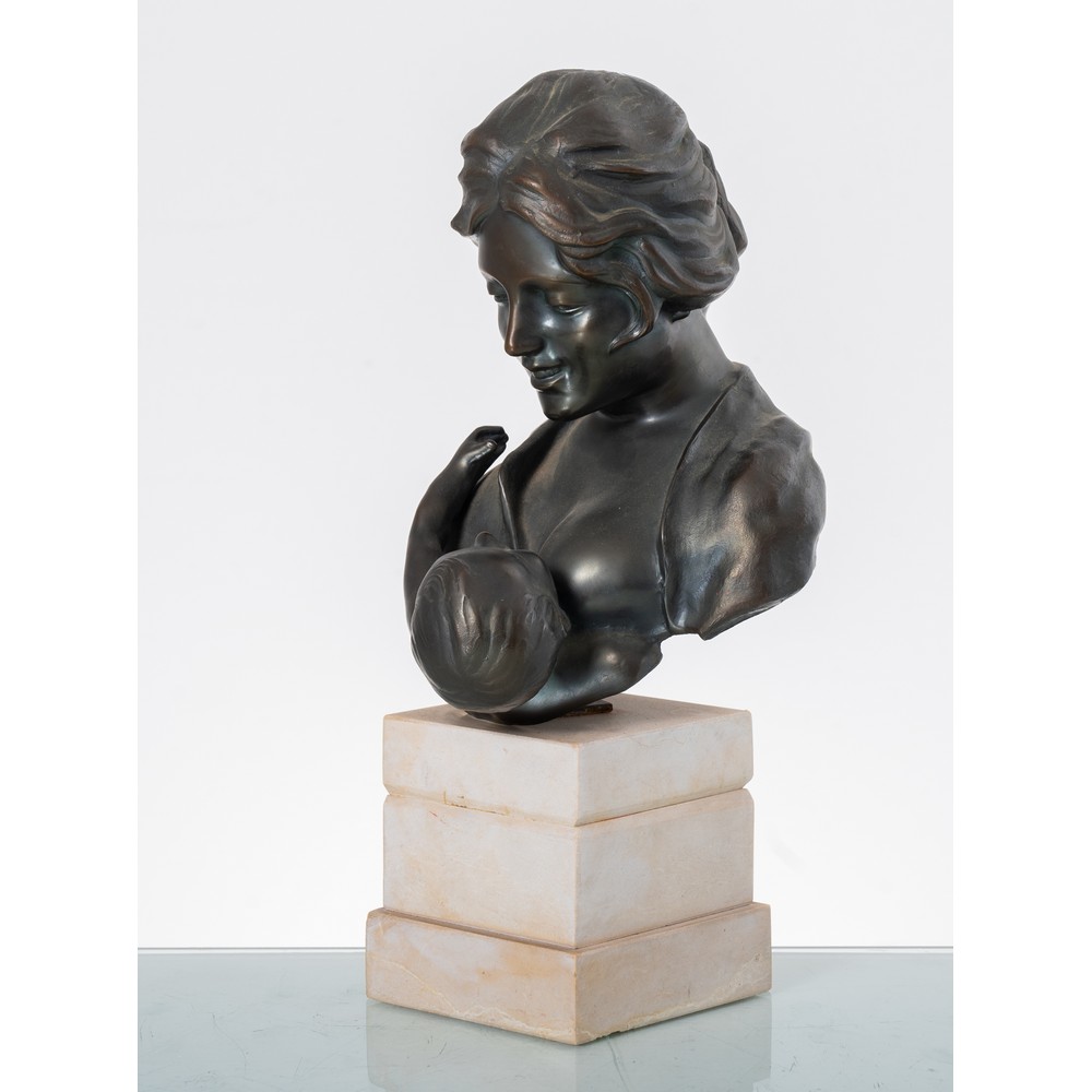 SCULTURA in antimonio raffigurante "Maternità" con base in marmo bianco.