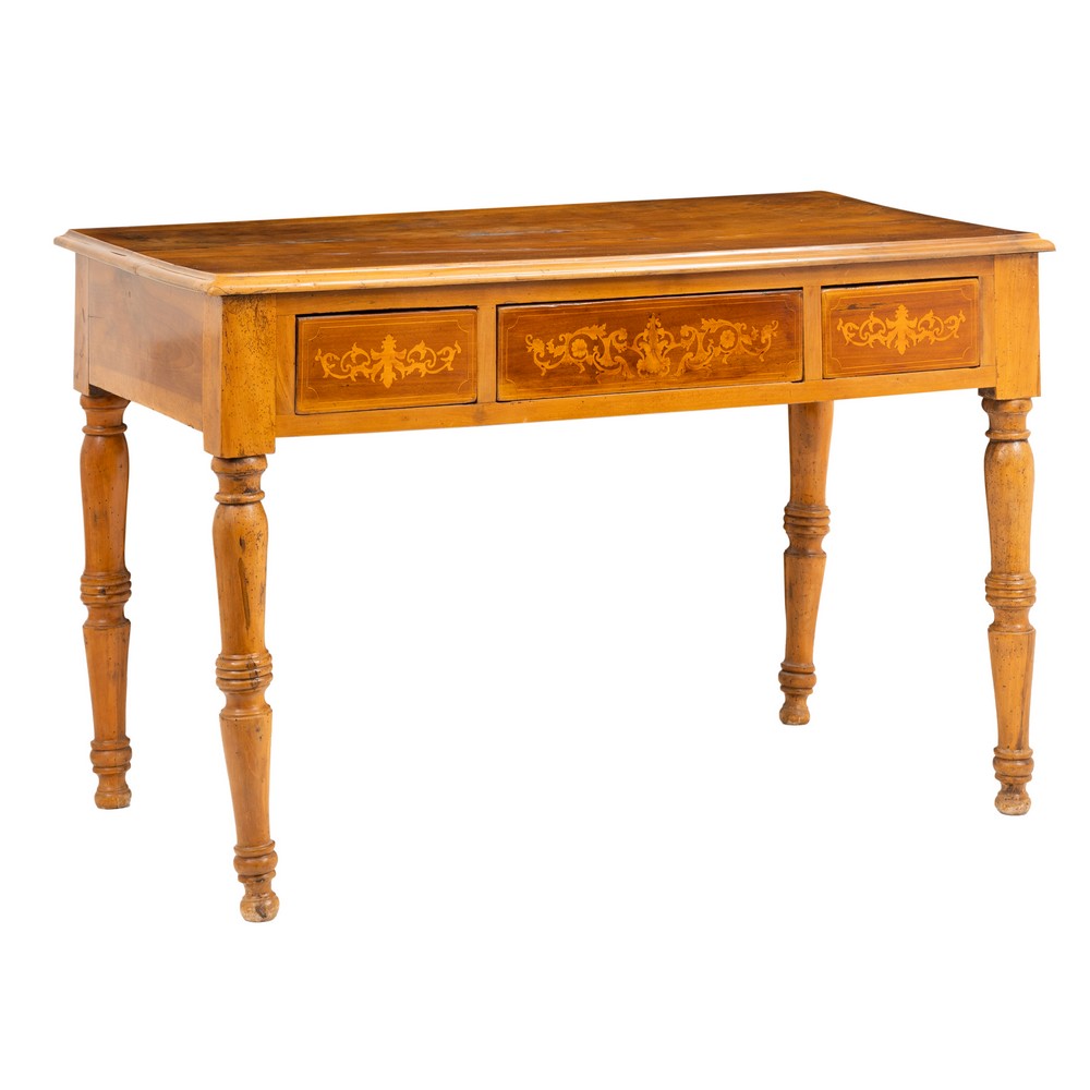 Scrittoio con tre cassetti in legno di noce con tarsie in legno di bosso.