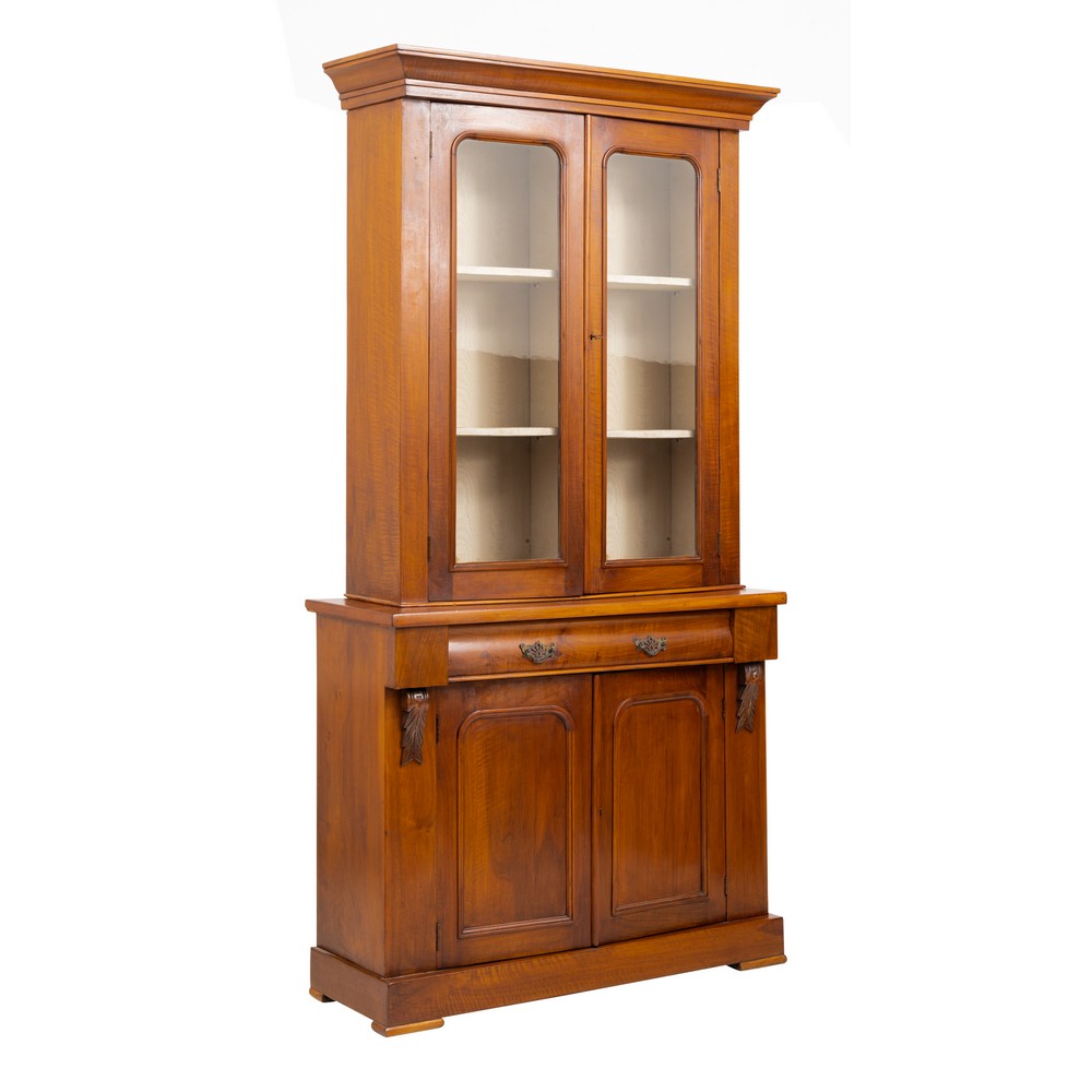 Libreria doppio corpo con cassetto e due ante a vetro nella parte sovrastante e due ante nella parte sottostante, periodo vittoriano.
