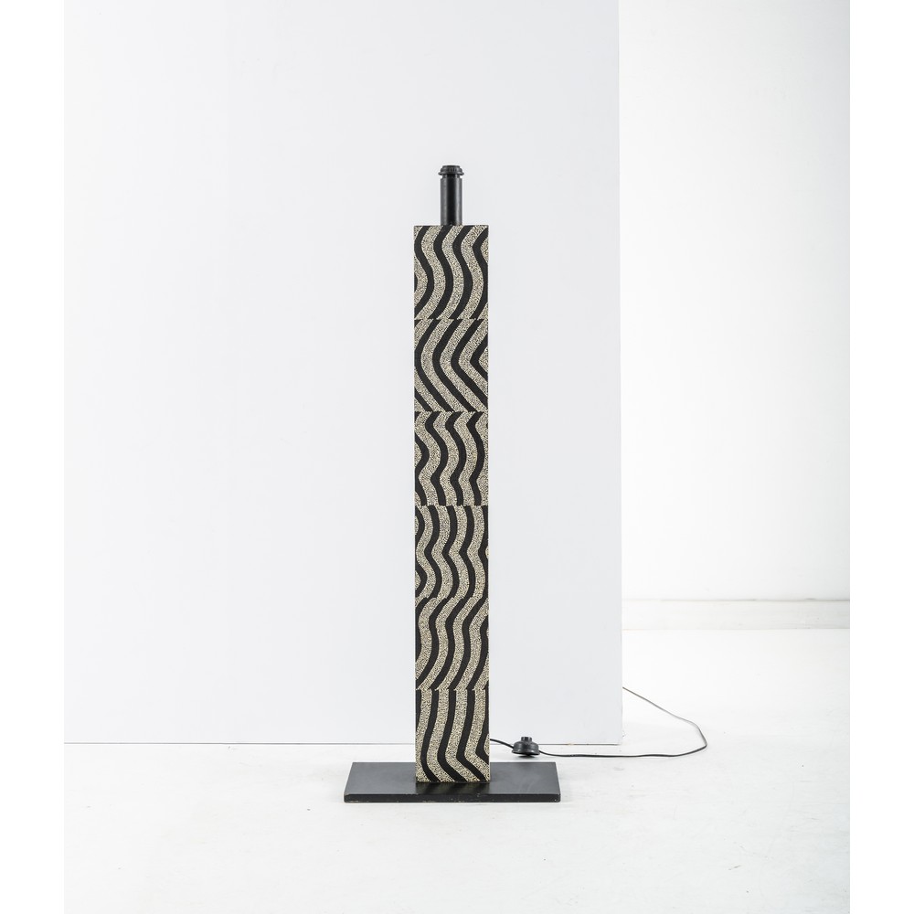 Lampada da terra ad una luce, struttura in legno a decori tribali neri e bianchi, base rettangolare.