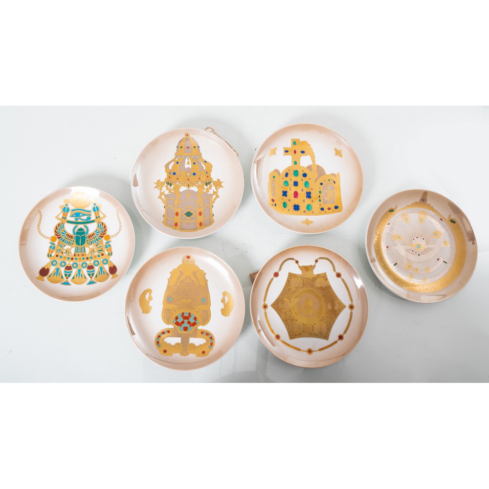 Collezione di sei piatti produzione Morbelli in porcellana decorata con smalti ad oro zecchino e platino.