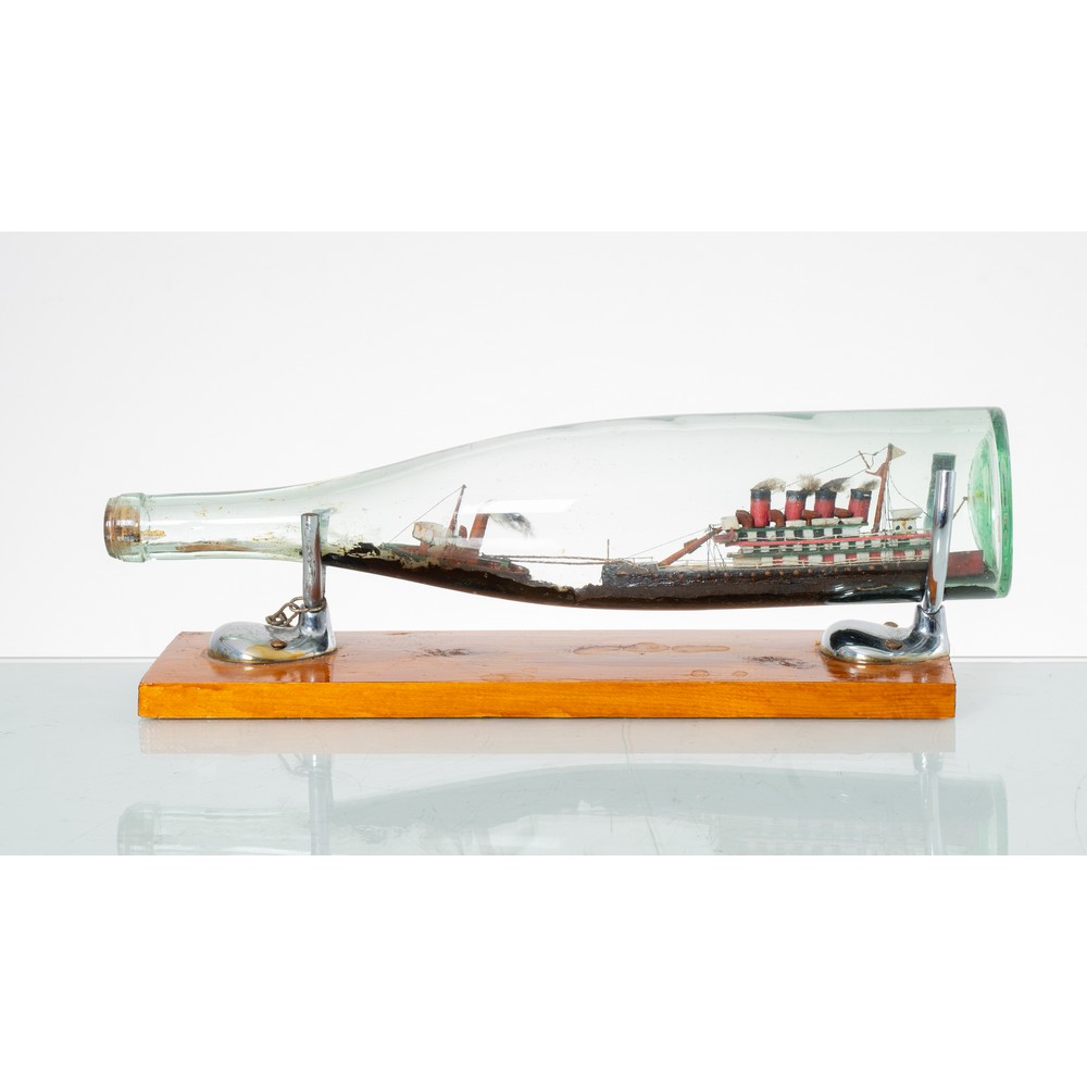 Nave con rimorchiatore in legno entro bottiglia in vetro.