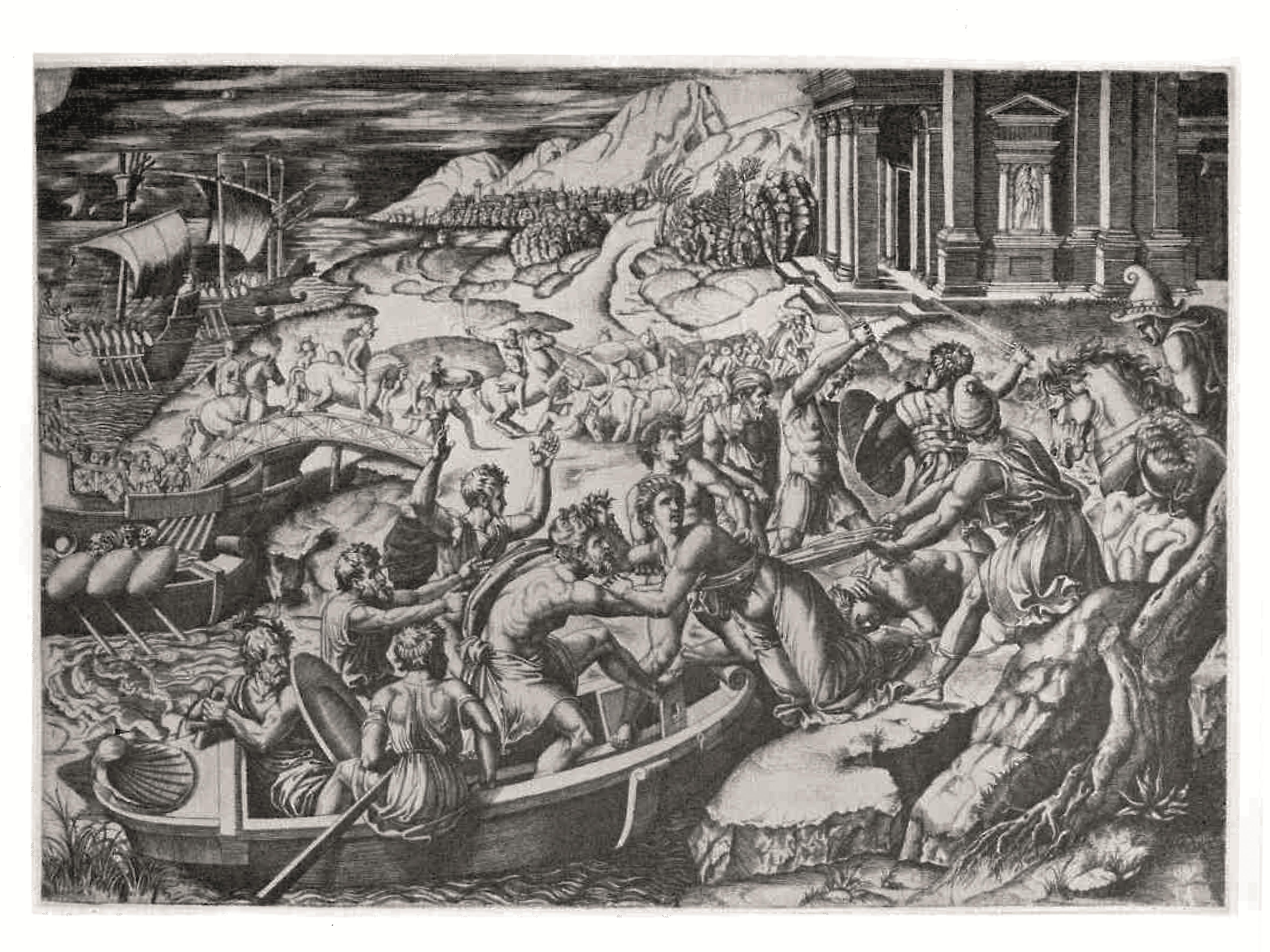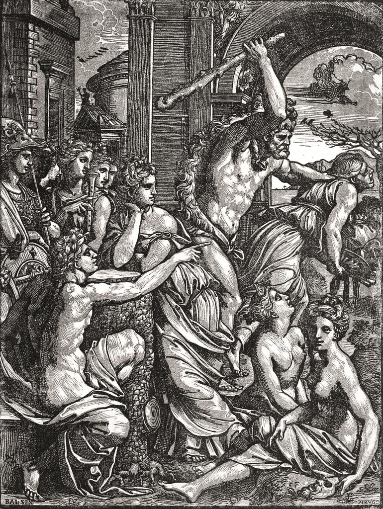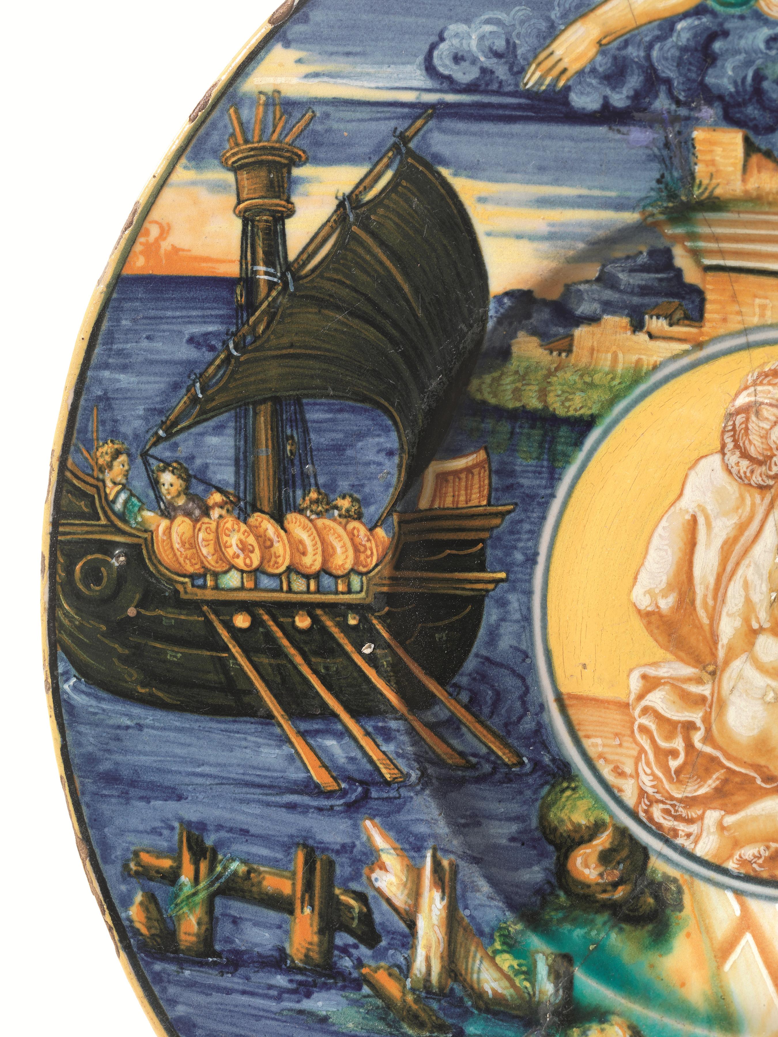 Come spesso avviene nei lavori del pittore rodigino, anche in questo caso si riconosce l’uso di più incisioni. La nave è tratta da un particolare dell’incisione del Ratto di Elena di Marco Dente (1493-1527) da Raffaello Sanzio. Per la figura della Pizia si potrebbe pensare a una delle figure derivate dalla Cappella Sistina e divulgate per stampa; ci pare però di riscontrare una somiglianza nel corpo della Pizia con quello di Vulcano raffigurato in un piatto del Walters Museum of Art di Baltimora, assegnabile al periodo compreso tra il 1528 e il 1532. Carmen Ravanelli Guidotti nel suo saggio su alcune opere inedite o poco note di Xanto Avelli, presentando il piatto in esame aveva già ipotizzato che la figura potesse essere stata tratta dall’incisione del Maestro del Dado con Ercole che scaccia l’invidia dal Parnaso: la posizione della figura che assiste alla scena seduta in basso richiama molto da vicino quella della nostra. La studiosa suggerisce inoltre una certa vicinanza con il piatto con il suicidio di Porzia, presentato nello stesso saggio: entrambe le opere andrebbero datate cioè attorno agli anni 1528-1529. Per la figura di Teseo, Ravanelli Guidotti pensa che si possa accostare a quella di uno dei pastori che assistono al rapimento di Ganimede in una stampa di Gian Battista Palumba e alla figura di Dedalo della coppa del gruppo “F.R.” del Gardiner Museum.